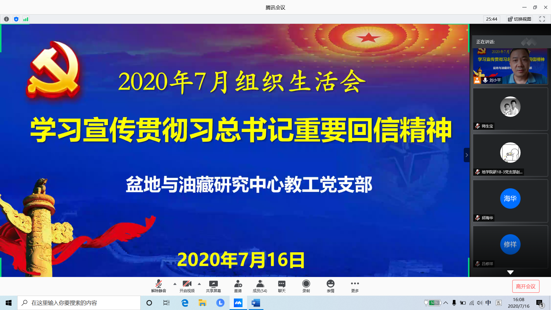 7月16日,地球科學學院盆地與油藏研究中心教工黨支部召開組織生活會(理論學習擴大會),專題學習宣傳貫徹習近平總書記重要回信精神。地學院黨委書記王貴文、克拉瑪依校區石油學院院長謝慶賓、盆地與油藏研究中心全體教師、2020屆赴西部油田基層工作的畢業生代表、聯合共建的三個研究生黨支部學生代表共56人參加學習,支部書記劉小平主持會議。