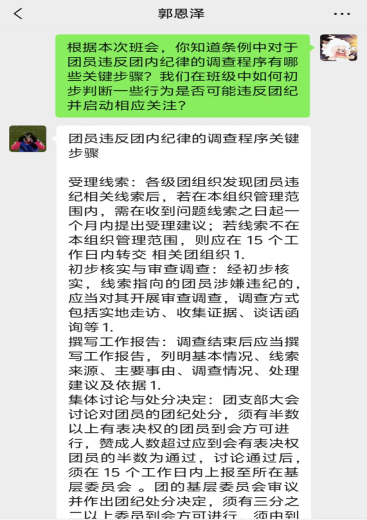 地研24-6團支部通過團紀知識學習、案例分析、分組討論、互動問答、總結發言開展學習地研24-1團支部組織骨干成員全面梳理《中國共產主義青年團紀律處分條例》條款,收集團紀處分典型案例(如因違反組織紀律、工作紀律等受到處分的實際團內事件)、相關政策解讀文章以及團史中紀律建設重要事件資料在班級廣泛宣傳。地研24-3團支部通過自學和集中學習相結合的方式,對條例進行了深入學習。將同學們分成小組進行討論,分享學習心得,探討如何在實際行動中落實團紀要求。