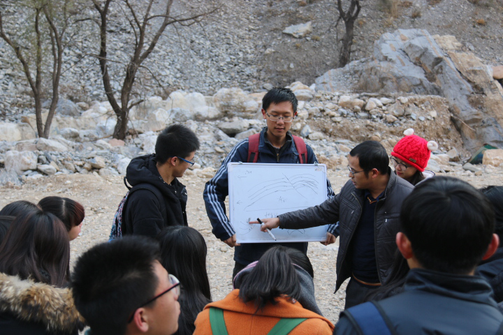 本次實習的目的是增進同學們對專業知識的理解,促進大家的學習積極性,加強本專業同學之間的交流,提高同學們對本專業學習的興趣,在實踐中鞏固知識。14日上午考察路線由余一欣老師、陳石老師、王子安老師等人對此次野外實習的路線進行的踏勘確定,保證了路線的安全性和創新性。考察過程中,按照前期的分組,工作人員負責各組人員的安全。 于一欣老師向大家講授了華北地臺地層、不整合接觸、波痕構造及滾動背斜,同學們認真學習并做相關記錄。