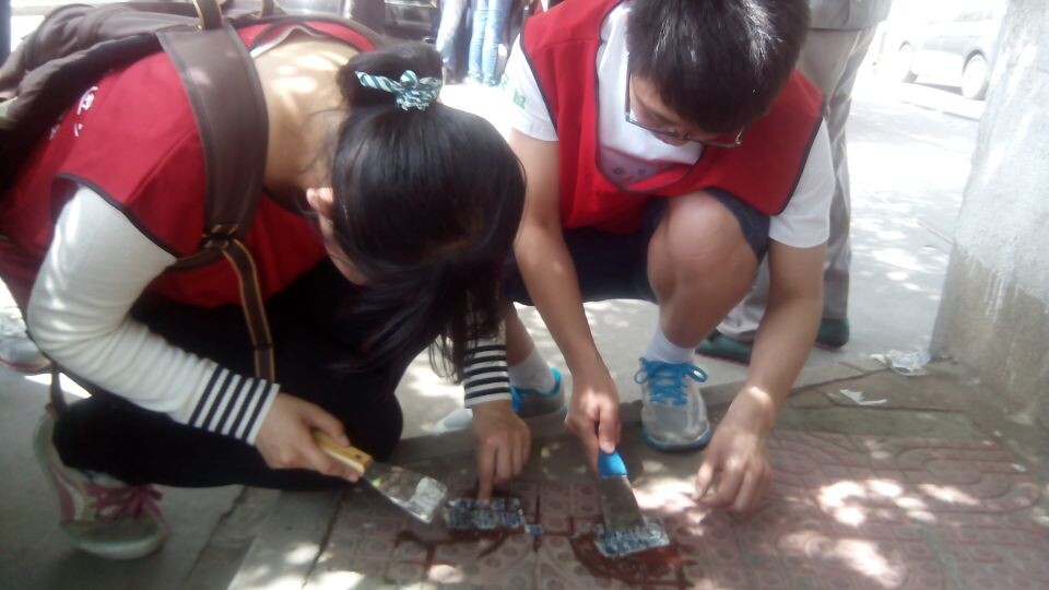 活動中,同學們積極踴躍,針對粘貼在地面、墻體上的各種宣傳廣告進行了集中地清理。有一些難以清理的小廣告,同學們先是利用攜帶的鐵鏟一點一點地清除,然后用礦泉水沖洗,再用毛刷進行刷洗直至小廣告完全清理干凈。在整個清理的過程中,同學們一直保持很高的熱情,積極活躍,認真細致,對一些小細節(jié)也十分注重。清理結束后,小區(qū)的地面、墻體、建筑物煥然一新,小區(qū)的環(huán)境得到很大的改善。