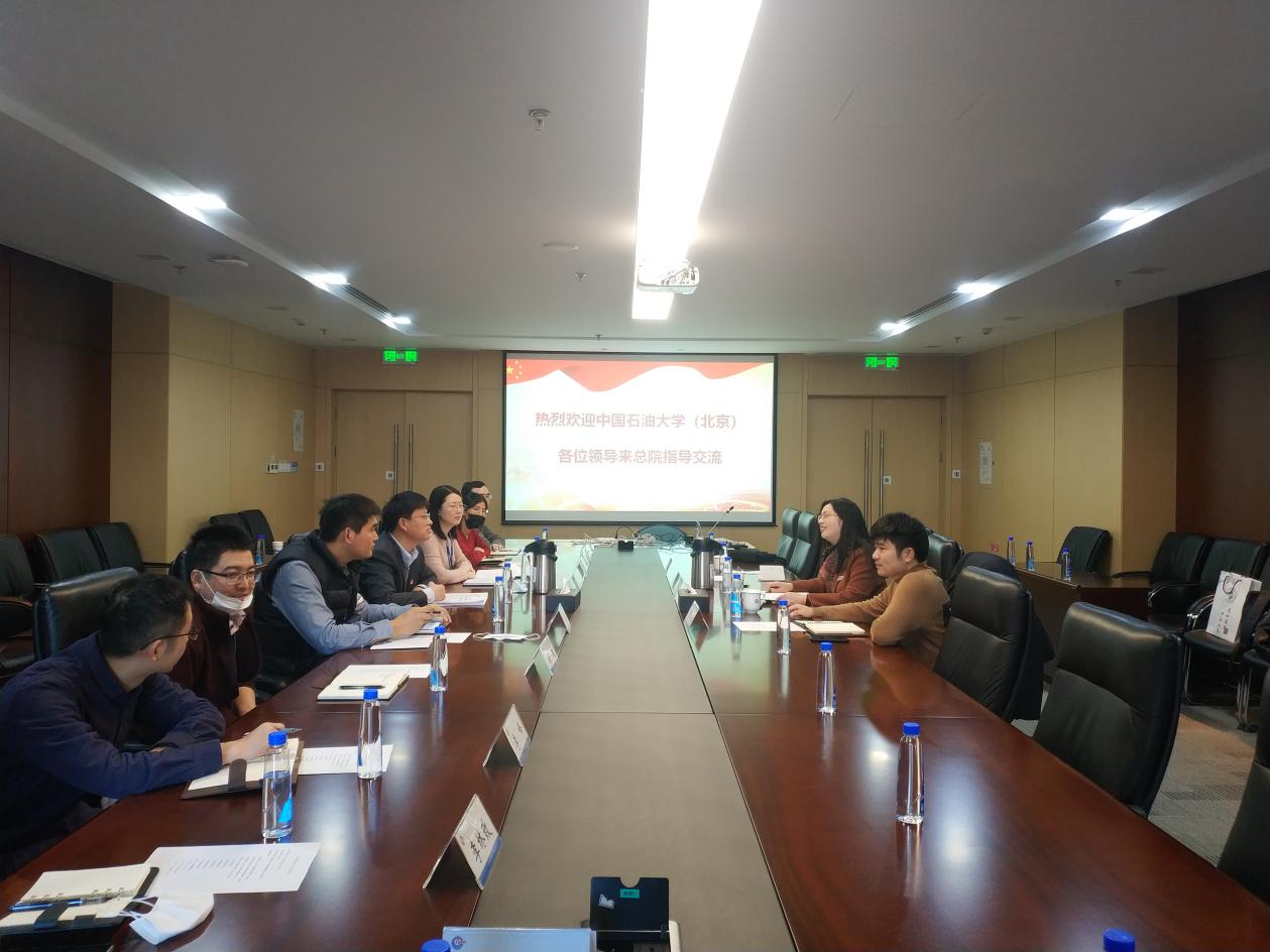 2020年12月16日,中國石油大學(北京)地球科學學院副院長陳冬霞、黨委副書記周學智、輔導員常小飛一行赴中海油研究總院調研交流。中海油研究總院辦公室主任王建文、人力資源部培訓主管劉楊、人力資源部人事主管王建新及六位校友出席會議。