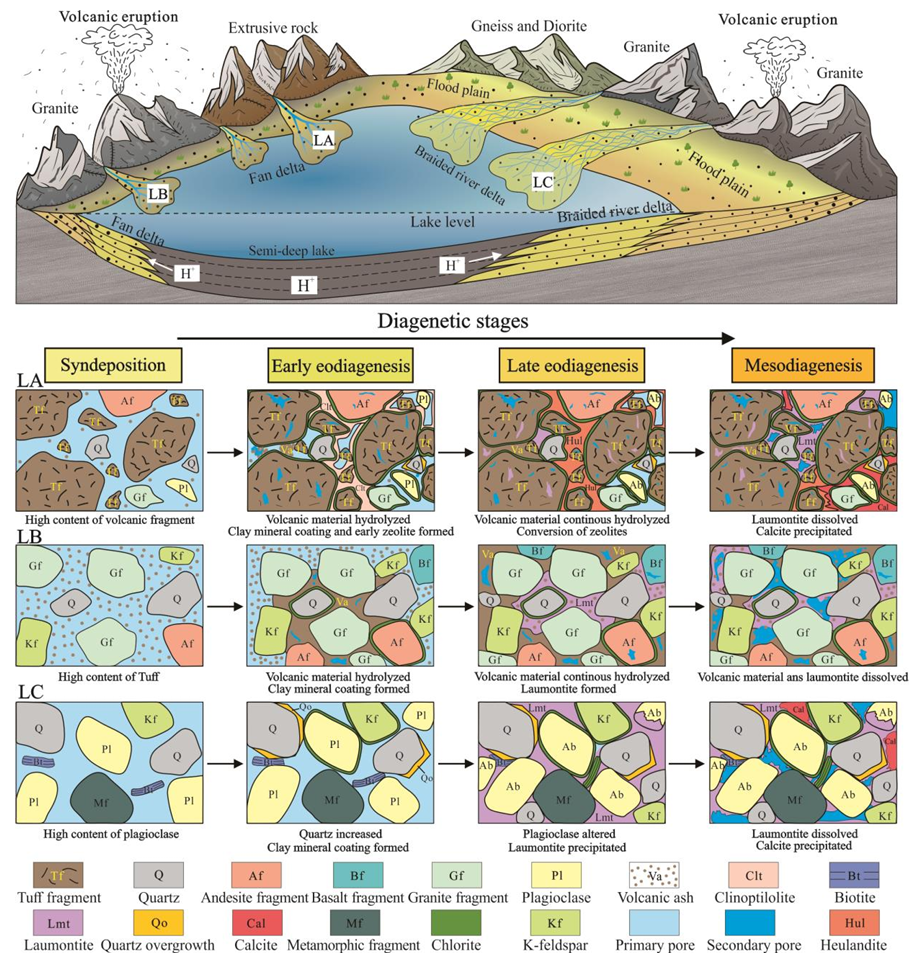 該研究成果《Characteristics, genesis, and significance of laumontite in sedimentary rocks of non-marine petroliferous basins in China》發表在地學著名期刊《Earth-Science Reviews》上。論文通訊作者為朱世發教授,第一作者為我院2023級博士研究生佟歡,中國石油大學(北京)油氣資源與工程全國重點實驗室和地球科學學院為第一完成單位。