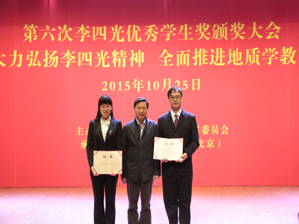 “第六次李四光優(yōu)秀學(xué)生獎”共表彰了18位求學(xué)期間在地質(zhì)類專業(yè)領(lǐng)域上突出的學(xué)生,國土資源部部長姜大明為他們頒獎并親切交談。我校地學(xué)院12級碩士生張佳佳和12級本科生張毅穎分別獲得“李四光優(yōu)秀碩士研究生獎”和“李四光優(yōu)秀大學(xué)生獎”。張佳佳專業(yè)基礎(chǔ)扎實,勤于思考,勇于創(chuàng)新,目前已發(fā)表學(xué)術(shù)論文7篇,其中國內(nèi)SCI1篇,以第一作者發(fā)表國際三區(qū)SCI論文一篇,同時以第一作者發(fā)表兩篇國際重要會議論文。張毅穎學(xué)習(xí)成績優(yōu)異,是北京市三好學(xué)生和“先鋒杯”優(yōu)秀團(tuán)員,本科三年,共獲得5項國家級獎勵,4項省部級獎勵,10項校級獎勵,以第一作者發(fā)表兩篇學(xué)術(shù)論文。