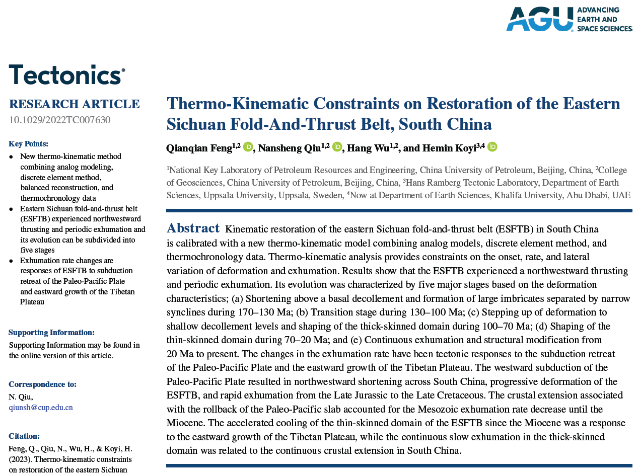 近日,我院優(yōu)秀學(xué)科博士后馮乾乾在沉積盆地構(gòu)造-熱演化研究方面取得重要進(jìn)展,和邱楠生教授、瑞典烏普薩拉大學(xué)Hans Ramberg構(gòu)造實(shí)驗(yàn)室Hemin Koyi教授合作完成的研究成果《Thermo-Kinematic Constraints on Restoration of the Eastern Sichuan Fold-And-Thrust Belt, South China》發(fā)表在地學(xué)領(lǐng)域頂級(jí)期刊《Tectonics》上。論文通訊作者為邱楠生教授,中國(guó)石油大學(xué)(北京)油氣資源與工程全國(guó)重點(diǎn)實(shí)驗(yàn)室和地球科學(xué)學(xué)院為第一完成單位。《Tectonics》是地球科學(xué)領(lǐng)域的一區(qū)TOP期刊,擁有重要的學(xué)術(shù)影響力,期刊重點(diǎn)出版地球巖石圈的演變,結(jié)構(gòu)和變形相關(guān)的前沿科學(xué)報(bào)道。