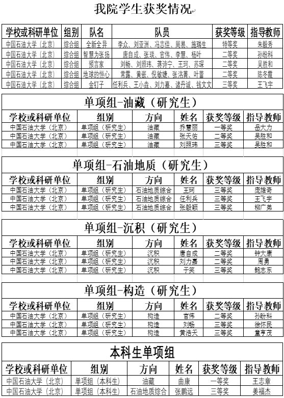 在2017年10月22日結束的第二屆全國油氣地質大賽上,我院學子表現出色,經過激烈的角逐,由2015級研究生李眾、劉亞洲、馮志佳、周易、施瑞生組成的“全新全異”隊斬獲大賽最高獎項:綜合組特等獎。2016級研究生喬慧麗獲得研究生單項組油藏評價方向一等獎,曲康獲得本科生單項組一等獎。此外,我院學子還獲得綜合組二等獎3項,三等獎1項,研究生單項組二等獎4項,三等獎7項,本科生單項組三等獎1項。岳大力、王志章、朱毅秀三位教師獲大賽優秀指導教師。由我院學生杜一帆、楊慧、曹天宇組成的中國石油大學(北京)代表隊榮獲知識競賽二等獎。