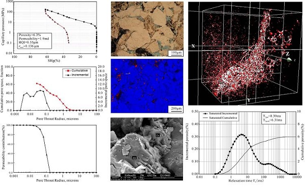 綜合表征致密砂巖儲(chǔ)層中發(fā)育的不同類型和不同尺度大小的孔喉組合特征是油氣儲(chǔ)層研究前沿和熱點(diǎn)領(lǐng)域,該研究在闡明孔隙結(jié)構(gòu)影響地質(zhì)因素的基礎(chǔ)上,綜合研究了基于鑄體薄片、掃描電鏡、壓汞曲線、核磁共振、氮?dú)馕胶?/span>CT掃描的孔喉表征方法,并引入分形維數(shù)的方法來實(shí)現(xiàn)孔喉特征精細(xì)表征。在不同尺度大小孔喉體系特征表征、孔喉微觀特征與宏觀物性聯(lián)系、二維及三維孔喉特征綜合評(píng)價(jià)等方面提出了創(chuàng)新性認(rèn)識(shí)。