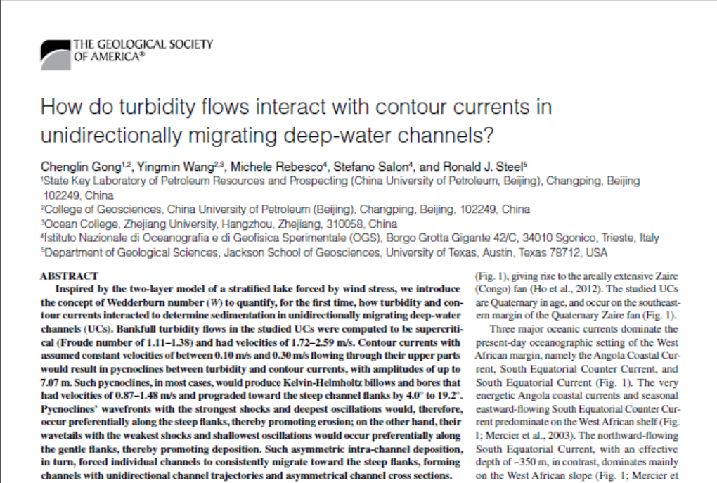 我校地球科學學院青年教師龔承林博士和中國石油大學(北京)王英民教授、意大利國家海洋和地球物理研究中心的Michele Rebesco博士(《Marine Geology》主編)和Stefano Salon博士、美國德克薩斯大學奧斯汀分校Ronald J. Steel教授合作完成的研究成果《How do turbidity flows interact with contour currents inunidirectionally migrating deep-water channels?》發(fā)表在地學領(lǐng)域頂級期刊《Geology》上(見下圖)。《Geology》具有重要的學術(shù)影響力,五年平均影響因子為5.047,在“Web of Science引文數(shù)據(jù)庫”中地質(zhì)學領(lǐng)域連續(xù)11年排名第一。