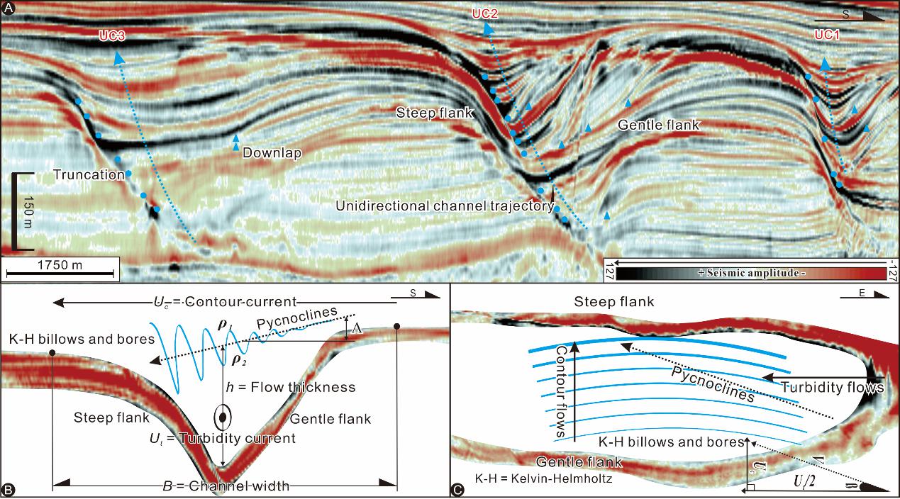 “濁流與等深流交互作用”是深水大洋中除“重力流”和“底流”之外的第三大搬運沉積作用過程,其沉積動力學機制是當今深水沉積學研究的前緣和薄弱環(huán)節(jié)。該研究以西非下剛果盆地發(fā)育的深水單向遷移水道為例(下圖A),通過流體動力學計算揭示(理論模型見下圖B和C):當流向遷移水道遷移一側(cè)(陡岸)的等深流(邊界流速為10或30 cm/s)與遷移水道中的超臨界濁流(內(nèi)弗勞德數(shù)為1.11到1.38,流速為1.72到2.59 m/s)交互作用時能夠形成一個“濁流與等深流密躍層”。該密躍層在遷移水道內(nèi)形成Kelvin-Helmholtz(K-H)波,這些K-H波以2.53至4.15 m/s的速度和4.0°到19.2°的角度斜交水道的陡岸,從而使得振動最劇烈、波長最大、振幅最強的“K-H波頭部”出現(xiàn)在水道的陡岸,以侵蝕作用為主;而低速的“K-H波尾部”出現(xiàn)在水道的緩岸,以沉積作用為主。由此可見,濁流與等深流交互作用可在水道內(nèi)產(chǎn)生“陡岸侵蝕-緩岸沉積”的過程響應(yīng),從而驅(qū)動水道向陡坡一側(cè)持續(xù)穩(wěn)定地遷移疊加,形成如下圖A所示的深水單向遷移水道。