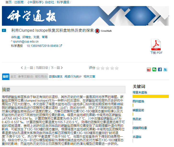 近日,我院邱楠生教授指導的博士生徐秋晨在國內著名綜合類期刊《科學通報》上發表學術研究成果《利用Clumped Isotope恢復沉積盆地熱歷史的探索》。《科學通報》是由中國科學院和國家自然科學基金委員會共同主辦的、我國最早的自然科學綜合性學術刊物之一,致力于快速報道自然科學各學科基礎理論和應用研究的最新研究動態、消息、進展,點評研究動態和學科發展趨勢,每年在石油地質學科領域刊文數少于10篇。