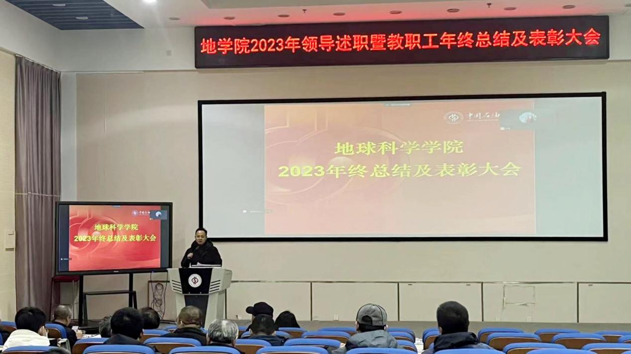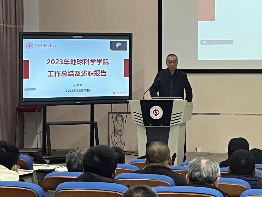 凝心聚力擔(dān)使命,奮楫揚帆新征程。2023年12月28日下午,地球科學(xué)學(xué)院以線上線下相結(jié)合的方式,舉行2023年學(xué)院領(lǐng)導(dǎo)述職暨教職工年終總結(jié)表彰大會。學(xué)院黨委書記姜福杰、院長王貴文、黨委副書記王茹、副院長牛花朋、劉鈺銘以及全院教職工參加會議。大會由學(xué)院黨委書記姜福杰主持。