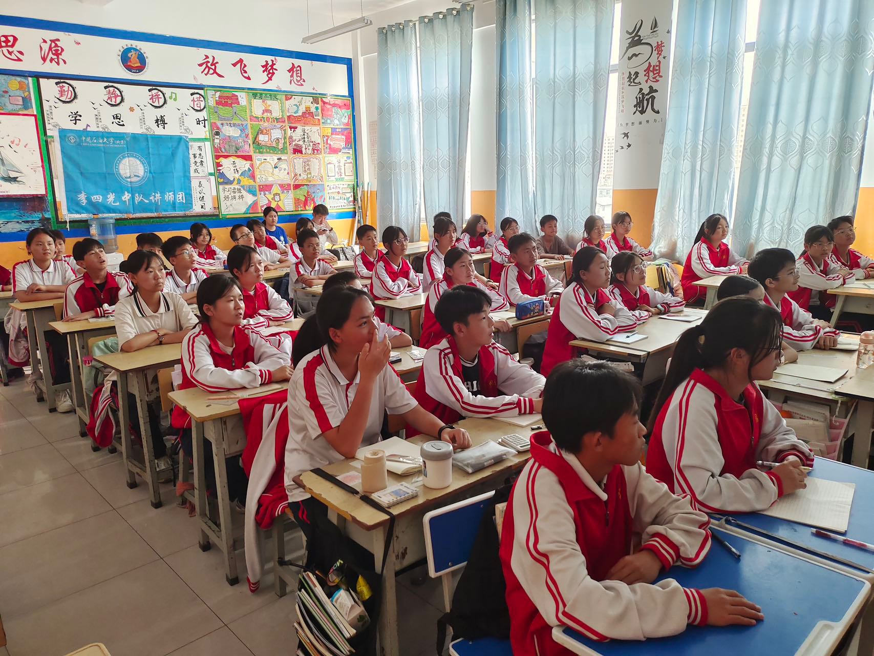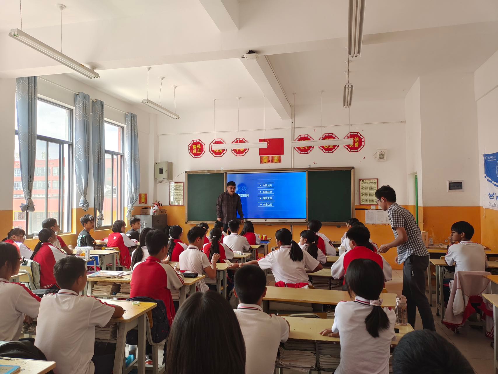 講師團由學院輔導員朱銳、王思聰和楊麗君帶隊,特邀學院盆地與油藏研究中心教師黃永輝、江強,圍繞“地質之美、石油之源、探索之路和未來之約”等四個方面,分別從地球地質地貌形成原因、石油勘探開發歷程、現代化油氣田建設現狀以及雙碳背景下能源行業發展方向等角度切入,帶領南華縣思源實驗學校的學生們深入感受以“李四光精神”引領下的中國現代地質科學工作者“為國加油,為國爭氣”的拳拳報國之心。