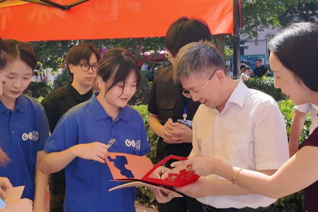 在溫馨的交流現場,有兩位特別的新生,她們在報到后便主動申請加入迎新的志愿者隊伍,充分展現了地學院學子的青春擔當。這兩位新生熱情洋溢地拿出錄取通知書,真誠的邀請金校長簽名勉勵,并落落大方地進行了自我介紹: