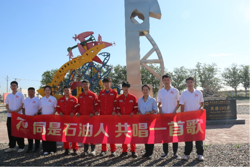 實踐團與校友們還來到位于克拉瑪依市白堿灘區的新中國第一口日產超百噸的“英雄193井”,聆聽英雄事跡,實地調研學習,在現場與校友們共同唱響校歌《我為祖國獻石油》,大家在激揚高亢的旋律中更加堅定了“能源報國”“能源強國”的決心。