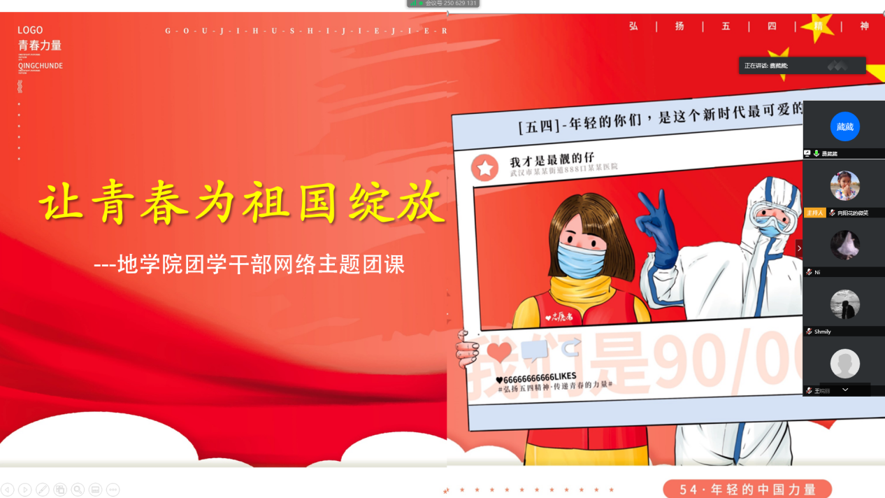 云學(xué)習(xí)—五四期間,學(xué)院團(tuán)員青年積極參與團(tuán)中央系列活動(dòng),共同感受抗疫過(guò)程中的青年擔(dān)當(dāng)和五四精神的磅礴力量。5月3日晚,學(xué)院各團(tuán)支部、學(xué)生社團(tuán)自主觀看了湖南衛(wèi)視聯(lián)合中國(guó)青年報(bào)社共同舉辦的城市接力唱演秀《青春萬(wàn)歲——五四接力大直播》。5月4日清晨,地學(xué)院2019級(jí)全體學(xué)生通過(guò)YY平臺(tái)收看我校升旗儀式直播,團(tuán)員代表通過(guò)升旗儀式“重逢”了久別的校園,隔著屏幕也能感受到石大青年連接在一起的力量。4日上午,地學(xué)院團(tuán)委組織全體團(tuán)干部通過(guò)線上形式集體參加了“青春為祖國(guó)綻放”網(wǎng)絡(luò)主題團(tuán)日活動(dòng),各支部、學(xué)生社團(tuán)通過(guò)不同方式組織團(tuán)員青年同步觀看。通過(guò)集體參與直播,學(xué)院團(tuán)員青年共同接受了一場(chǎng)沉浸式的身心洗禮,更完成了一場(chǎng)感同身受的精神盛宴。學(xué)院微信公眾平臺(tái)“地心引力cup”在5月4日發(fā)布專(zhuān)題推送——“@共青團(tuán)中央,這是今天的地學(xué)青年”。推送通過(guò)記錄地學(xué)院涌現(xiàn)出的優(yōu)秀青年學(xué)子的先進(jìn)事跡,讓團(tuán)員青年們更真切地感受到地學(xué)青年正在以親身行動(dòng),在傳承五四精神的路上永不停息。