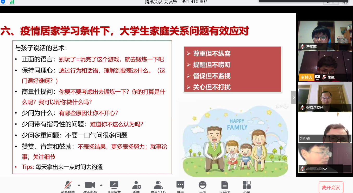 朱銳介紹了學(xué)生本學(xué)期主要課程安排、線上授課情況和獎(jiǎng)學(xué)金評(píng)定要求,并解讀了大學(xué)生征兵入伍政策。費(fèi)葳葳介紹了近年來(lái)學(xué)院學(xué)生就業(yè)和發(fā)展情況,講解了學(xué)生長(zhǎng)期居家學(xué)習(xí)情況下可能遇到的主要思想和行為問(wèn)題,分享了如何處理好親子關(guān)系的原則和技巧。宣講結(jié)束后,兩位老師針對(duì)留言區(qū)家長(zhǎng)們關(guān)切的問(wèn)題進(jìn)行了詳細(xì)地解答。
