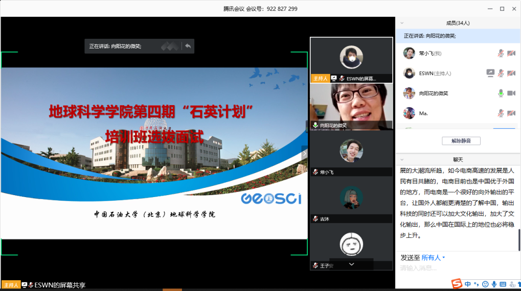 為深入學(xué)習(xí)習(xí)近平新時(shí)代中國特色社會(huì)主義思想,全面學(xué)習(xí)貫徹黨的十九大、團(tuán)的十八大和五四運(yùn)動(dòng)100周年紀(jì)念大會(huì)講話精神,落實(shí)教育部“三全育人”綜合改革試點(diǎn)工作要求,堅(jiān)定團(tuán)干部的理想信念,提升團(tuán)干部的理論及業(yè)務(wù)水平,增強(qiáng)團(tuán)干部的先進(jìn)性和光榮感,深入推進(jìn)共青團(tuán)改革,提升共青團(tuán)活力,培養(yǎng)具有紅色基因、家國情懷、國際視野、知行合一、品學(xué)兼優(yōu)的新時(shí)代青年。5月1日,地球科學(xué)學(xué)院團(tuán)委通過騰訊會(huì)議,以線上面試的方式進(jìn)行了第四期“石英計(jì)劃”培訓(xùn)班學(xué)員選拔。