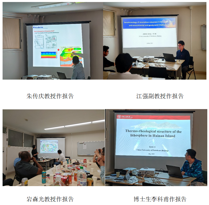 在為期一周的學術交流中,雙方圍繞地幔柱與熱演化、火山活動及深部動力學、盆地地溫場與地熱資源成因機制、巖石地球化學等前沿領域展開深入交流,聯合舉辦了CUP-ERI地球科學聯合研討會。朱傳慶教授作題為“Heat flow History of the Sichuan Basin, SW China—the thermal event record of Emeishan mantle plume”的學術報告,并介紹了我校在東部地熱成因機制研究方面的進展。江強副教授作題為“Geochronology of anomalous volcanism in the Indian Ocean and environmental and geodynamic implications”的學術報告,匯報了在印度洋海底火山方面的研究進展。博士生李科甫展作題為“Thermo-rheological structure of the lithosphere in Hainan Island”的學術報告,介紹了海南地溫場的深部控制機制。
