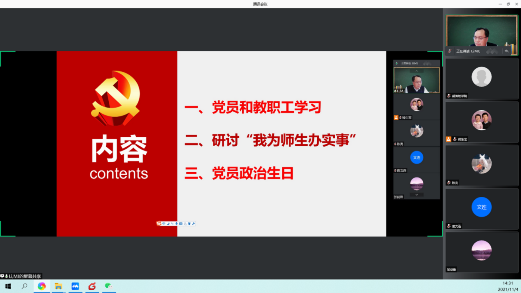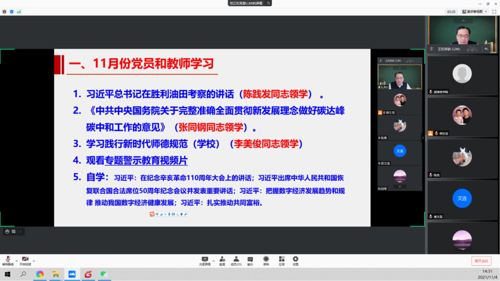 2021年11月4日下午,盆地與油藏研究中心教工黨支部組織全體教職工線上進行了黨員和教師理論學習,共有35位黨員和教職工參加了本次學習和研討,會議由李美俊同志主持,會議共分為三個階段。