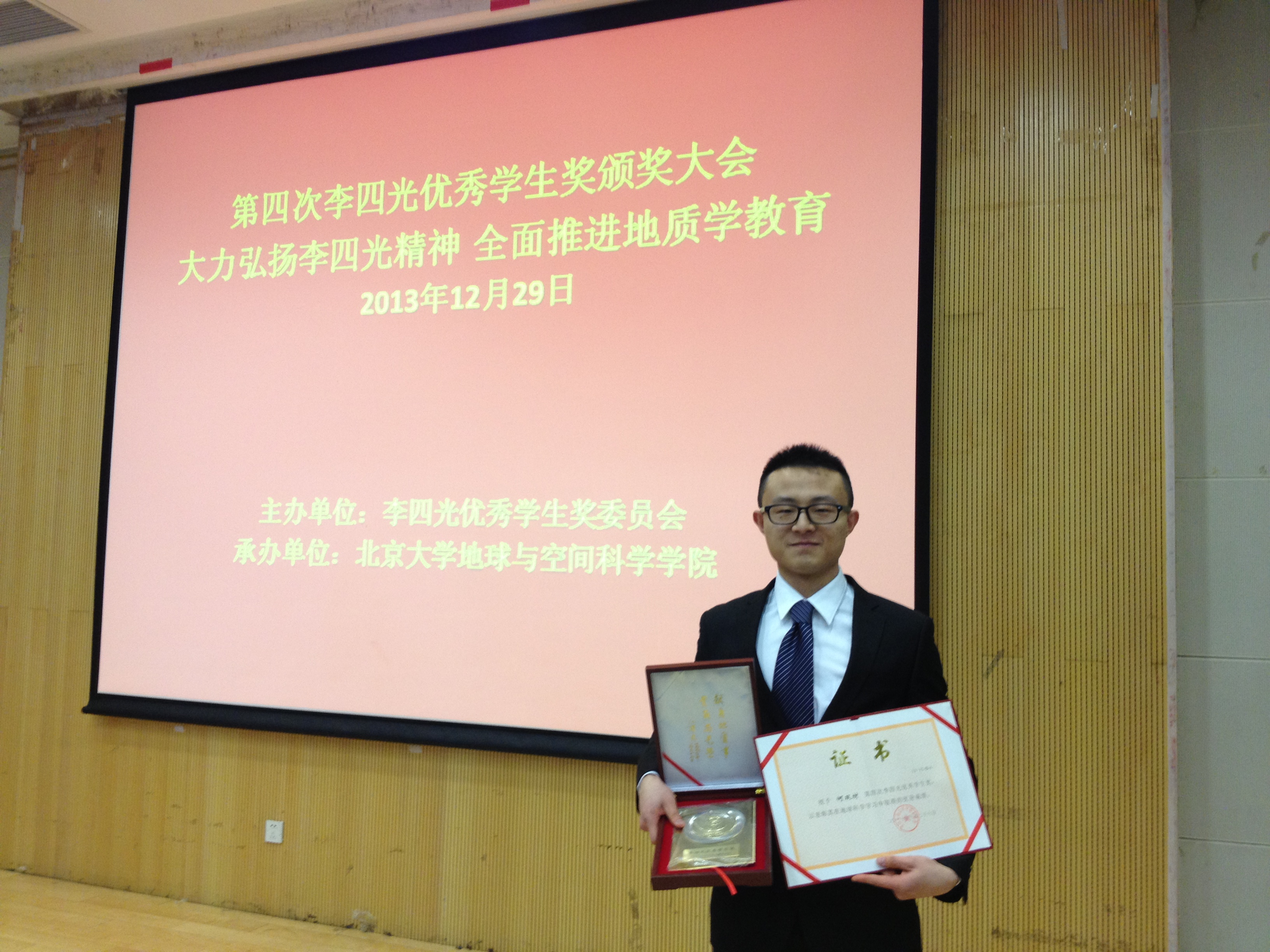 “李四光優秀學生獎”是為了紀念我國著名的科學家、地質學家、教育家、社會活動家、我國地質事業的奠基人之一李四光對我國科學事業和地質教育事業的巨大貢獻,繼承和發揚他從國家建設需要出發,積極從事科學、技術和教育實踐,不斷開拓創新,勇于攀登科學高峰的精神和愛國主義精神,鼓勵廣大地質類學生為社會主義現代化建設和科技進步多做貢獻而設立的,由教育部科技司、國土資源部科技司、北京大學、中國地質大學、中國石油大學和中國礦業大學等單位共同發起設立,李四光基金會全額資助。該獎項分為“優秀博士研究生獎”、“優秀碩士研究生獎”及“優秀大學生獎”三個類別,每年面向正在國內接受普通高等學歷教育的地質類學生進行評選。我院本科2007級楊茜、本科2008級于川淇、本科2009級王友偉、碩士2009級高平等同學也曾獲得過此獎項。