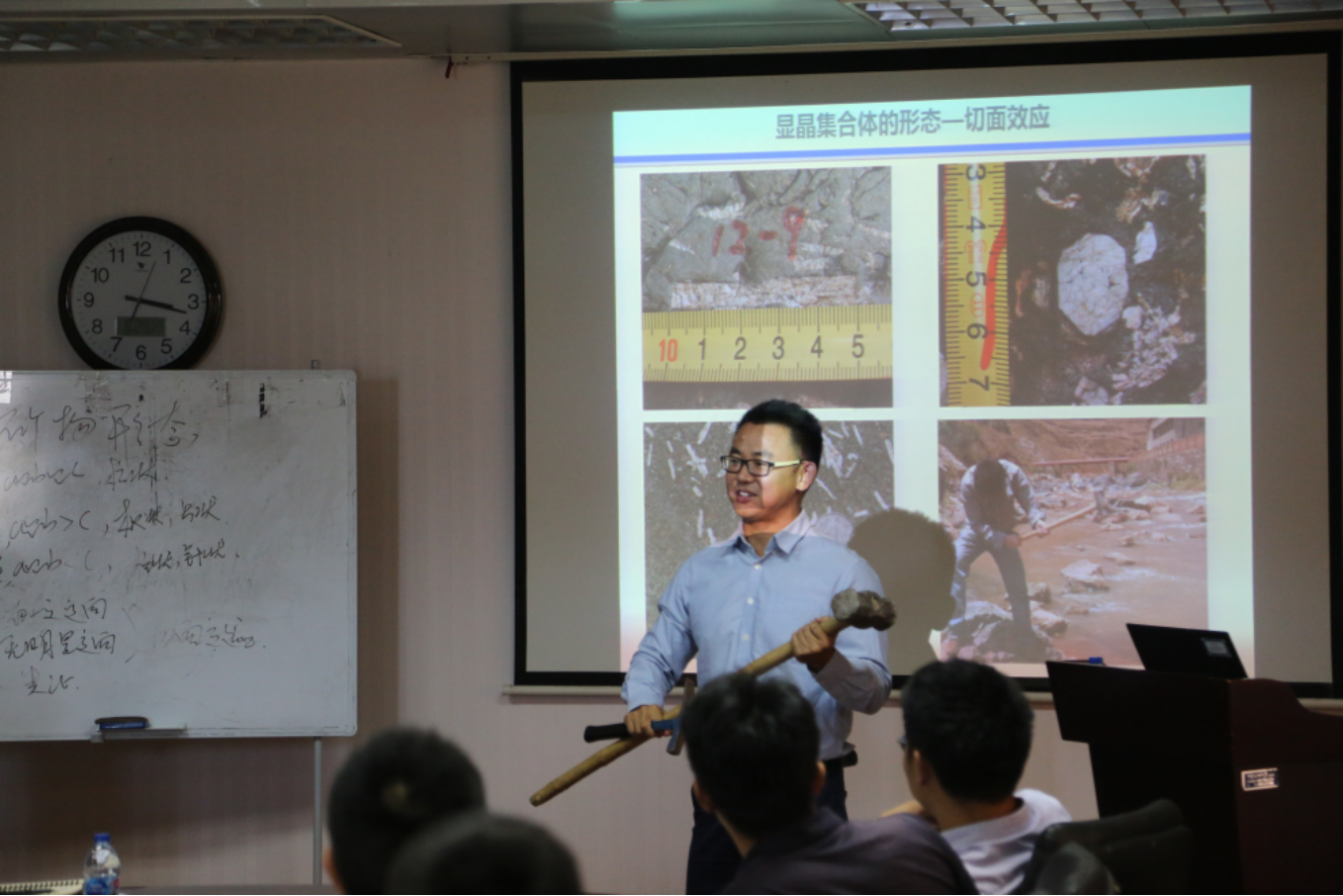 楊宗鋒老師以礦物的單體的形態等內容為例,以板書+PPT+礦物標本+地質工具等多種形式向各位老師展示了一節生動有趣的教學課程,并與參會教師在參賽以及教學技巧等方面進行交流。