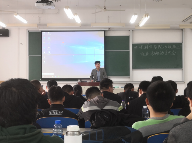 地學院黨委副書記周學智首先對當前就業形勢進行了解讀,并結合三大石油公司今年來校招聘情況、國家政策進行分析,鼓勵廣大畢業生積極擇業、就業。針對本科畢業生考研人數多、比例大的情況,他介紹了我院2019屆本科生考研考取情況及我院各專業2019年研究生招生基本情況,鼓勵大家擺正心態,合理安排考研時間,選擇適合自己的專業。會上,周書記還就學生提出的就業政策、就業手續的問題做出了解答。