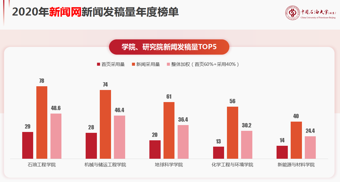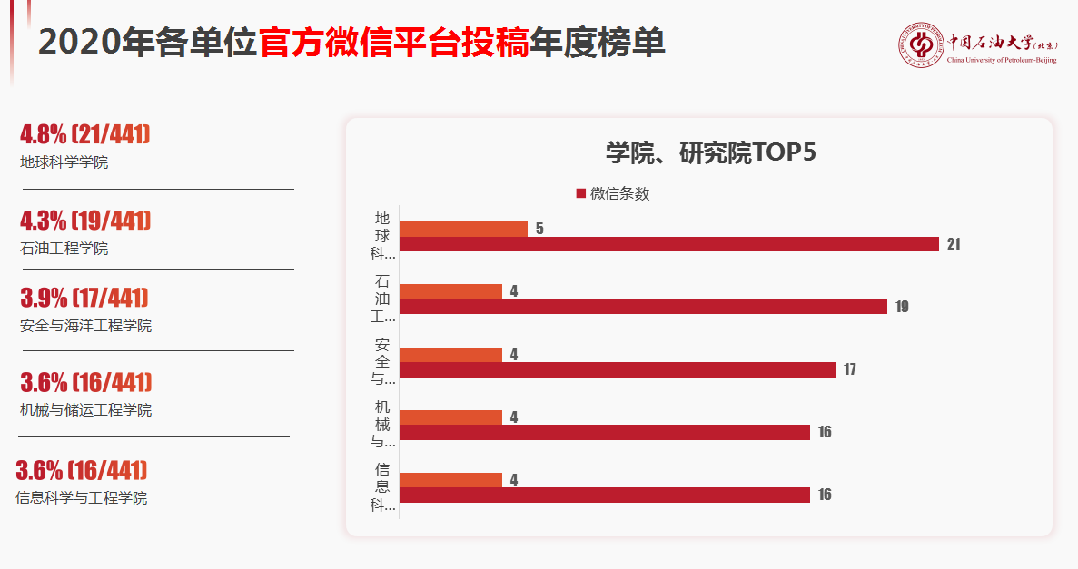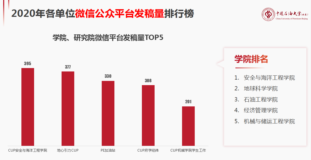 同時,黨委宣傳部負(fù)責(zé)人在表彰會上公布了2020年度新聞網(wǎng)新聞發(fā)稿年度榜單,官方微信平臺發(fā)稿年度榜單,各單位官方微信平臺投稿量排行榜、微信公眾平臺發(fā)稿量排行榜以及新媒體平臺年度熱文排行榜。我院年度新聞發(fā)稿量整體加權(quán)排名第三,向?qū)W校官方微信平臺投稿量排名第一,學(xué)院微信公眾平臺“地心引力CUP”以377篇年度發(fā)稿量排名第二。