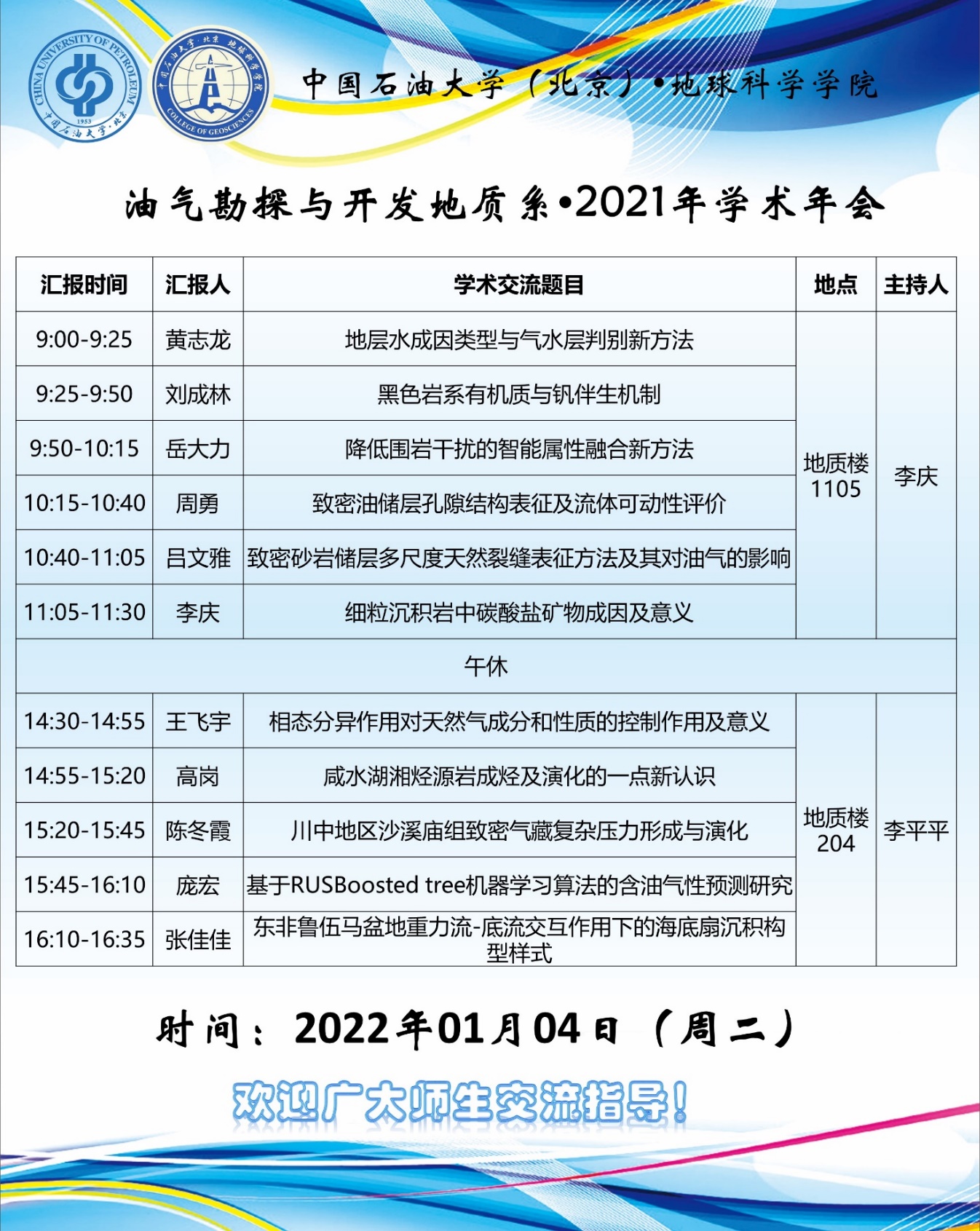2022年1月4日,地球科學(xué)學(xué)院油氣勘探與開發(fā)地質(zhì)系成功舉辦2021年學(xué)術(shù)年會(huì),大會(huì)由系主任李慶和系副主任李平平主持,黃志龍、劉成林、岳大力、王飛宇、高崗、陳冬霞、周勇、李慶、呂文雅、龐宏、張佳佳等共計(jì)11位資深教師做了學(xué)術(shù)報(bào)告,我校有六十余位師生參加了本次學(xué)術(shù)年會(huì)。