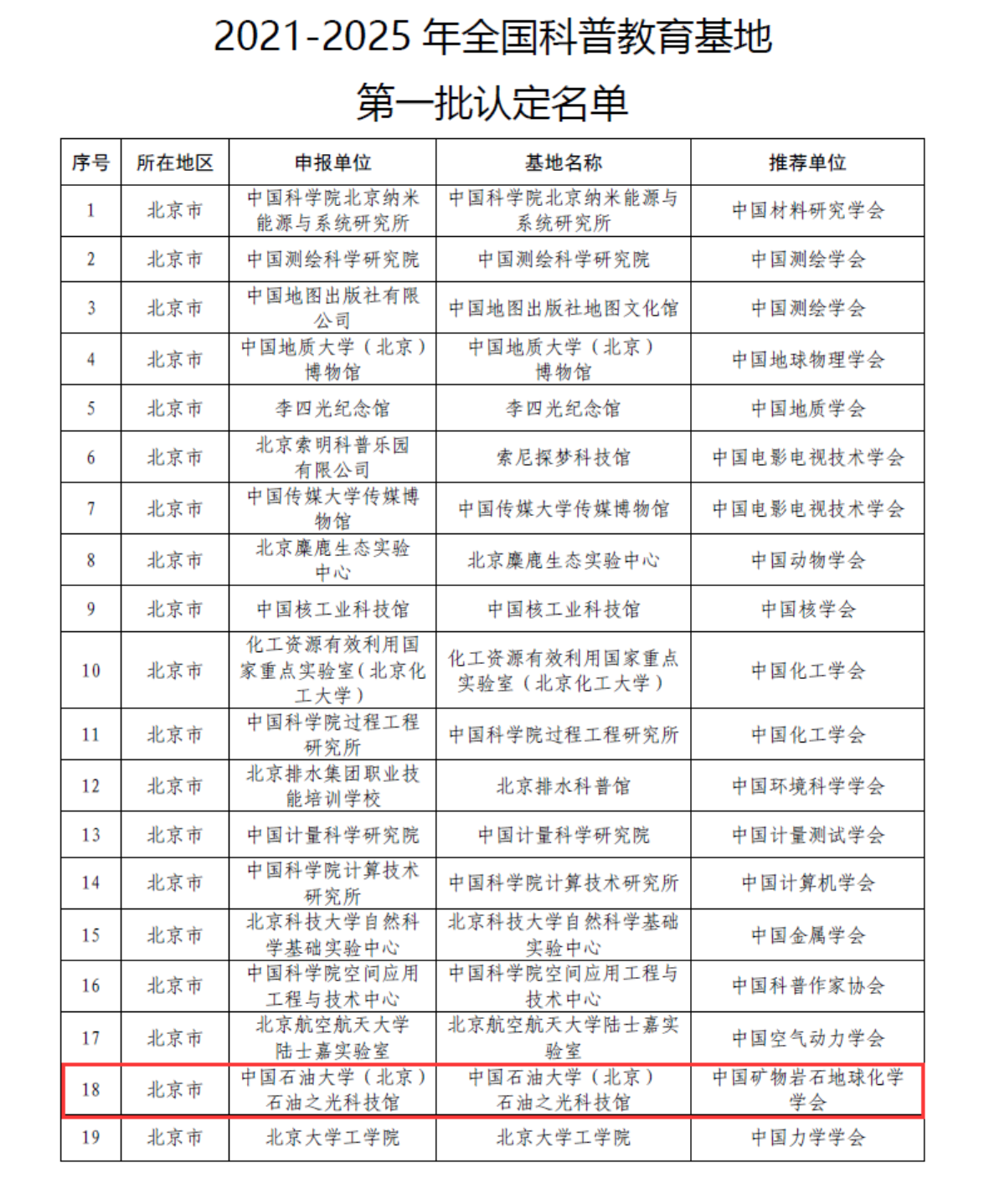 2022年2月7日,中國科協辦公廳公布了“2021-2025年‘全國科普教育基地’第一批認定名單”,我校石油之光科技館(含地球科學博物館)位列榜單第18位,正式入選“2021-2025年第一批全國科普教育基地”。