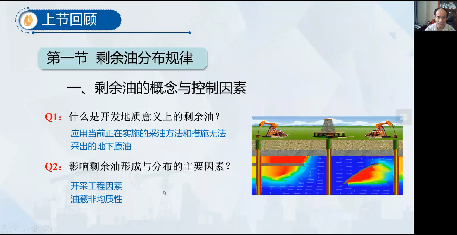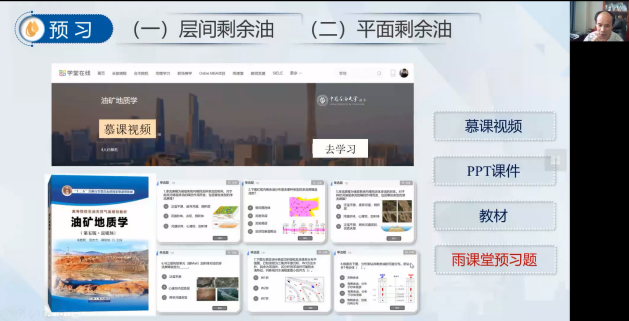 會(huì)議第二階段為示范課講授。吳勝和教授以油礦地質(zhì)學(xué)課程“第八章 油氣藏開發(fā)地質(zhì)中的動(dòng)態(tài)地質(zhì)分析”中的“層間剩余油”為主題,從知識(shí)點(diǎn)導(dǎo)入、問題鏈解析、師生互動(dòng)、信息工具使用、課程思政融入等方面對(duì)課堂教學(xué)元素進(jìn)行了展示,講授了一堂生動(dòng)的示范課。