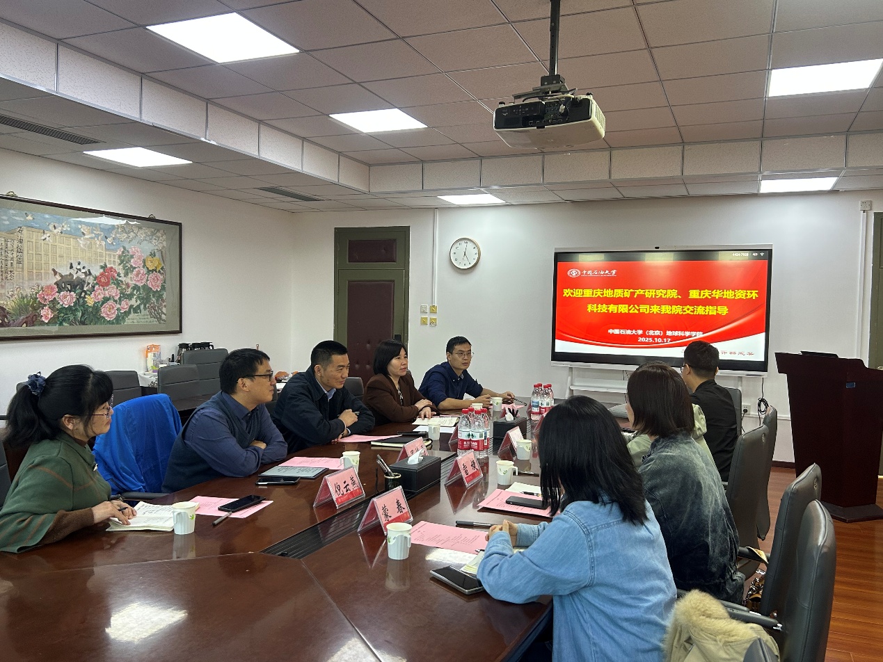 2025年10月17日,重慶地質礦產研究院頁巖氣分院院長張燁、重慶華地資環科技有限公司黨委副書記、紀委書記雷婕一行來我院走訪交流,地球科學學院黨委書記劉鈺銘、副院長羅情勇、牛花朋等在1105會議室進行了接待。會議由地球科學學院副院長羅情勇主持。