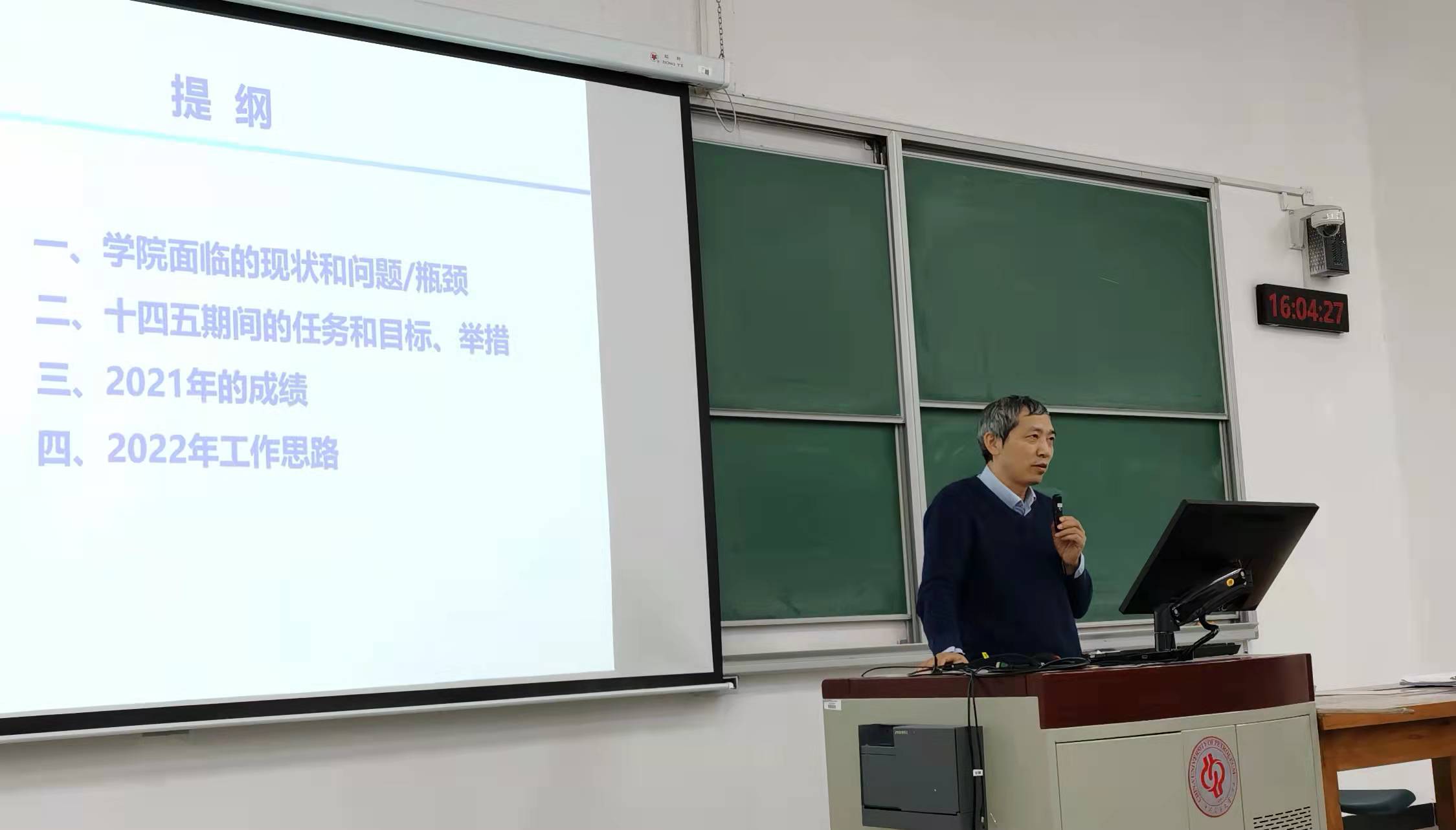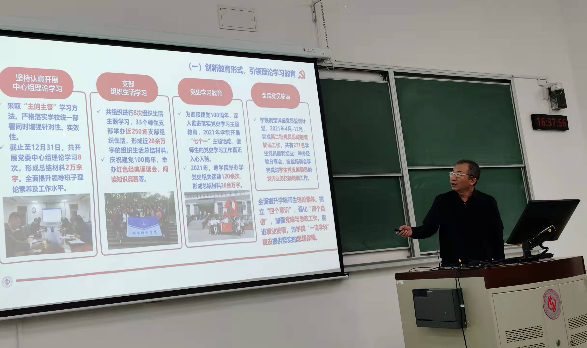 2022年1月6日下午,地球科學學院在三教307召開2021年領導述職暨教職工年終總結及表彰會議。地學院領導班子成員及全體教職員工參加了會議。會議由地學院黨委書記王貴文主持。
