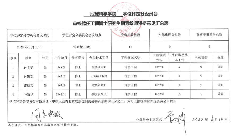 根據(jù)學(xué)校通知要求,學(xué)院學(xué)位評(píng)定分委員會(huì)于2020年6月10日下午2:00在地質(zhì)樓1105召開會(huì)議,該會(huì)議出席委員9人,由主席曾濺輝教授主持召開。對(duì)申報(bào)2020年工程博士研究生指導(dǎo)教師人員資格進(jìn)行審議并無記名投票,公示結(jié)果如下: