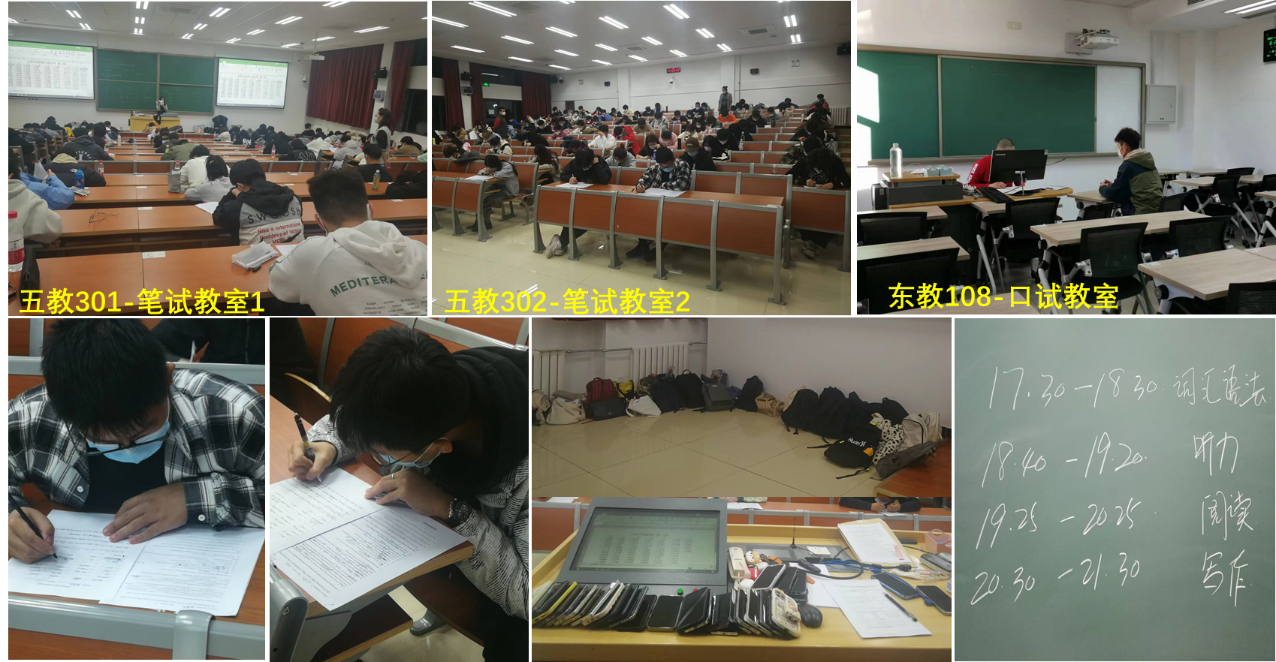 筆試于11月5日晚在五教201、301、501教室舉行,包括詞匯語法、雅思聽力、雅思閱讀、雅思寫作4個部分,歷經4小時。口試于11月6日全天在東教107、108教室舉行,老師與學生一對一進行,每人5-8鐘,口試全過程錄音,保證考試公平公正。