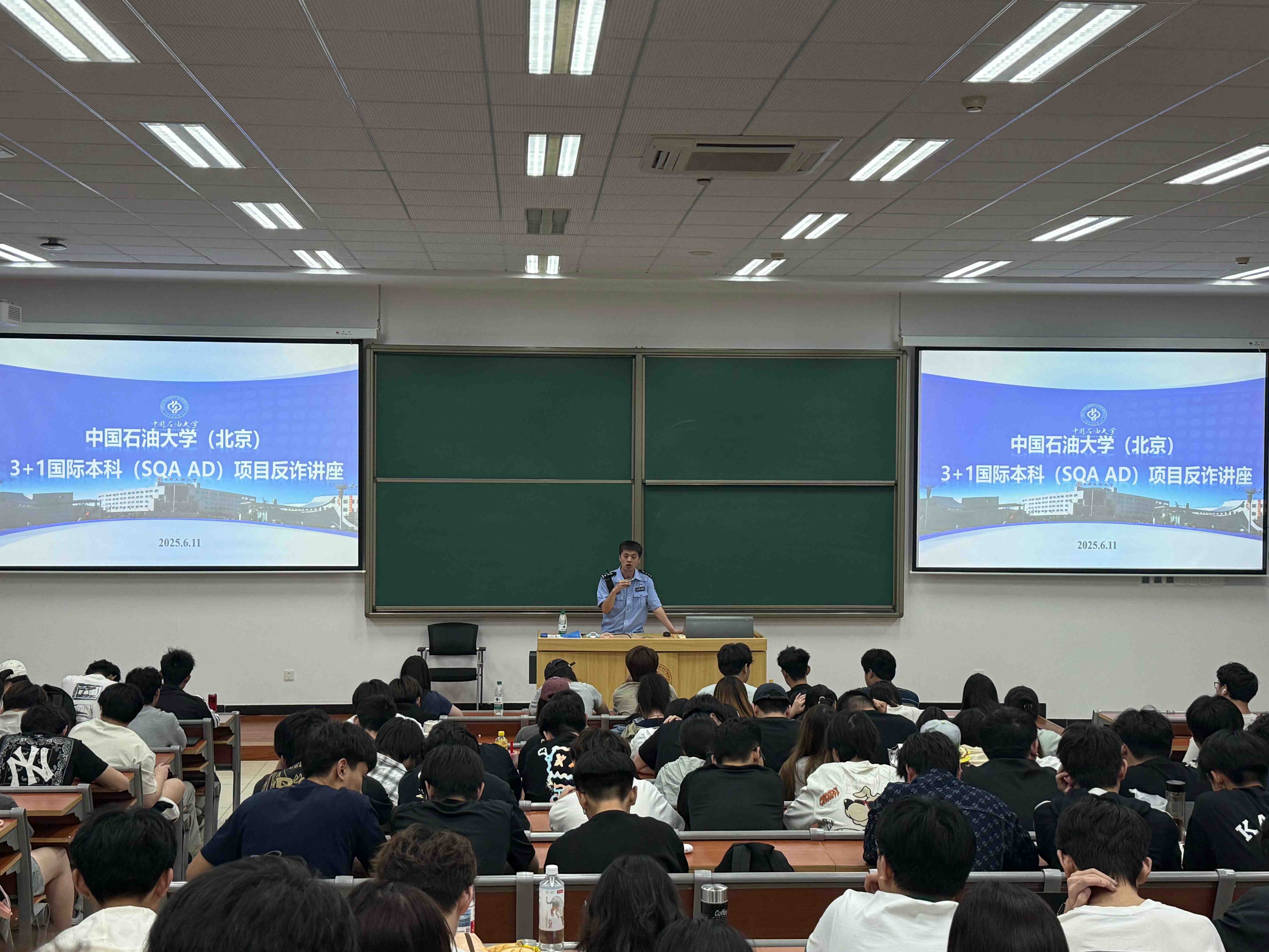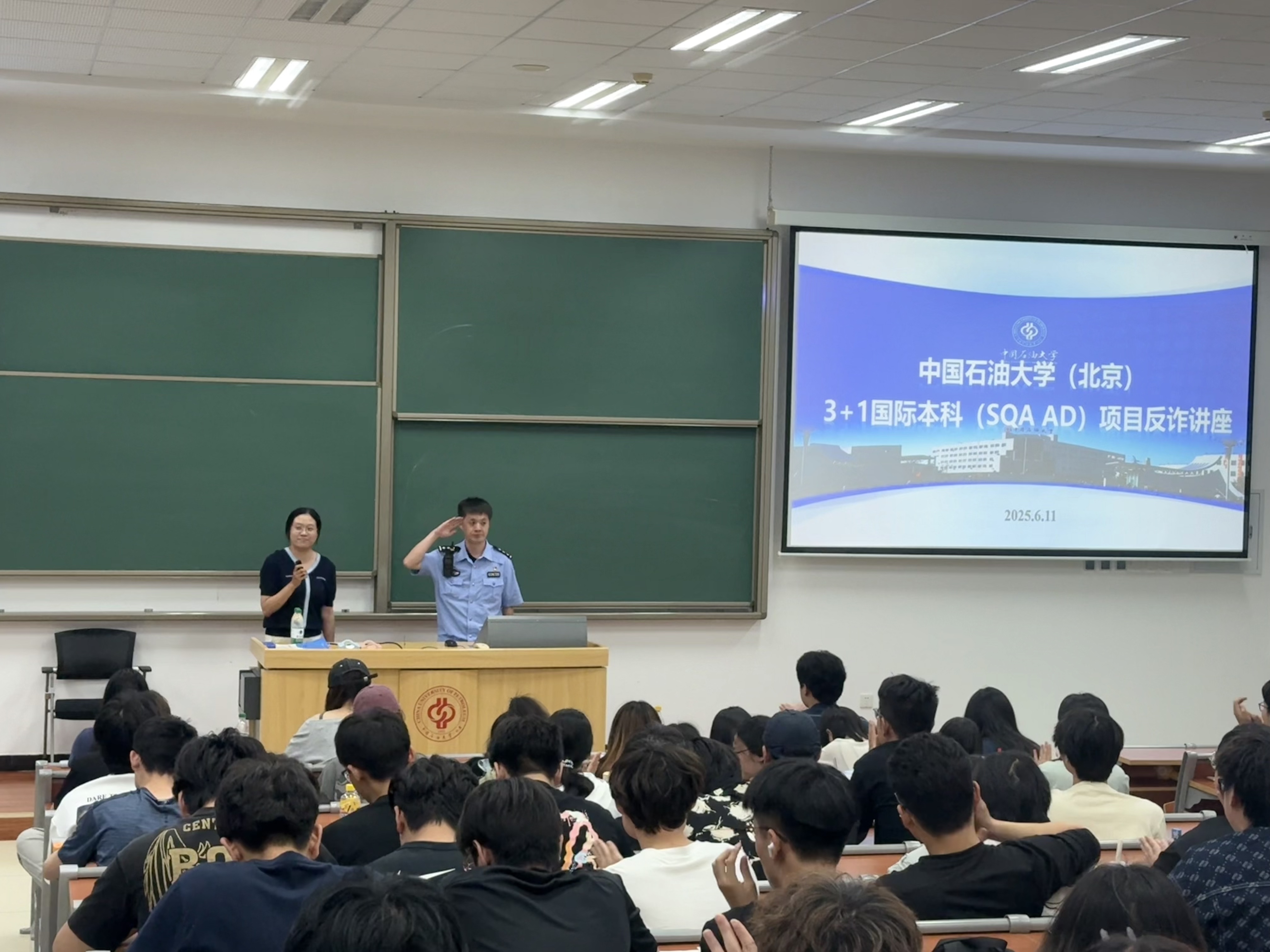 為有效提升學生的防詐騙意識,增強對各類詐騙手段的識別和防范能力,2025年6月11日,中國石油大學(北京)SQA項目邀請松園派出所副所長朱旭警官為學生干部開展主題為“反詐宣傳進校園”的安全教育講座。本次講座由出國留學教育中心主任萬璐老師主持。