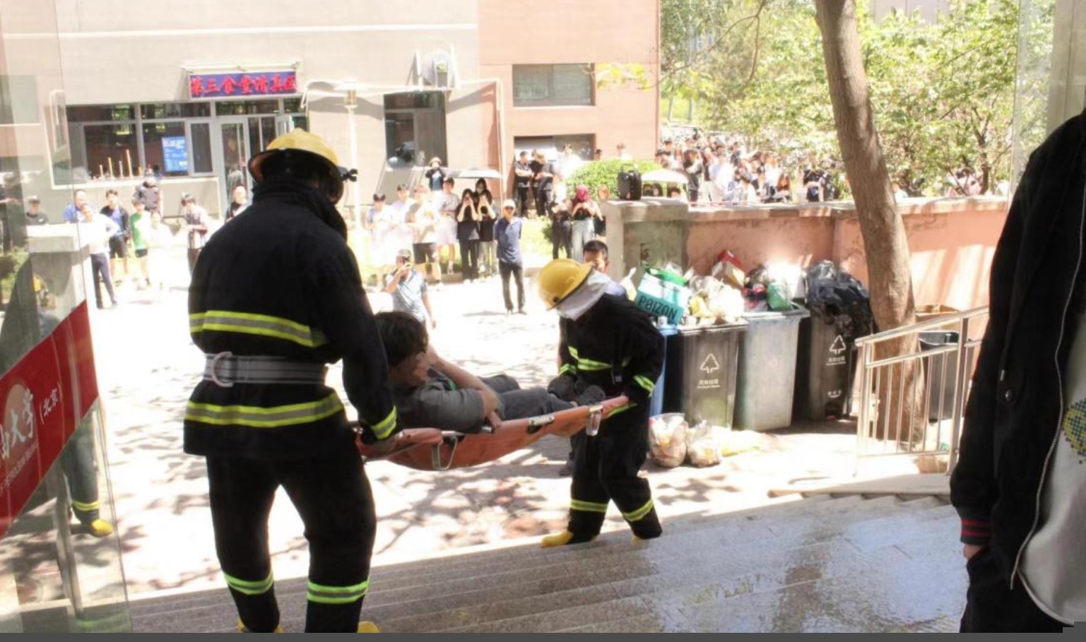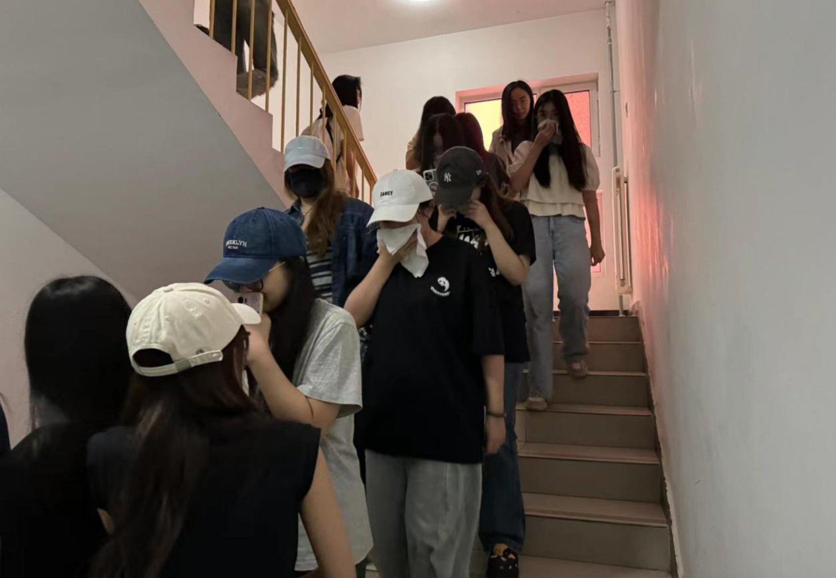 12點30分,由領導小組下達演練開始命令,警笛聲響起并在八號樓二層燃放煙零彈,一時間,公寓樓內煙霧彌漫,仿佛置身于真實的火災場景之中。公寓工作人員利用手搖報警器、喊話器通知各層人員疏散。疏散組打開所有疏散門,在引導員的鎮定指揮下,所有學生用濕毛巾捂住口鼻,彎腰低姿,按照既定的疏散路線,緊張而有序地撤離到安全地帶,各班清點人數并上報。