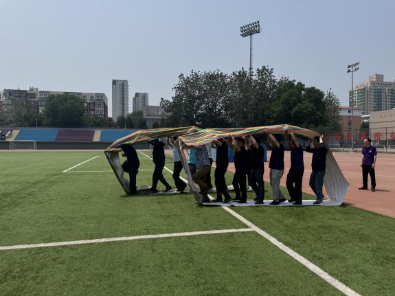 本次趣味運動會設置了“鼓動人心”“無敵風火輪”和“能量傳輸”三個集體項目,每一項都寓運動于娛樂、寓協作于競賽。“鼓動人心”比賽中,隊員們圍站鼓旁,眾手牽繩擊鼓顛球——節奏感與默契度被瞬間點燃,鼓面上的球一次次跳躍,高漲的歡呼聲令現場氣氛不斷升溫。緊隨其后的“無敵風火輪”將團隊配合推向高潮,參賽小組踏入由帆布卷成的“風火輪”內,步調一致、齊心奔跑。壓軸項目“能量傳輸”同樣精彩,教職工們手持半管接力傳球,既拼速度也考驗精準度,一旦小球平穩滑入下一段軌道,隊友之間的擊掌與喝彩瞬間讓賽場成了歡樂的海洋。
