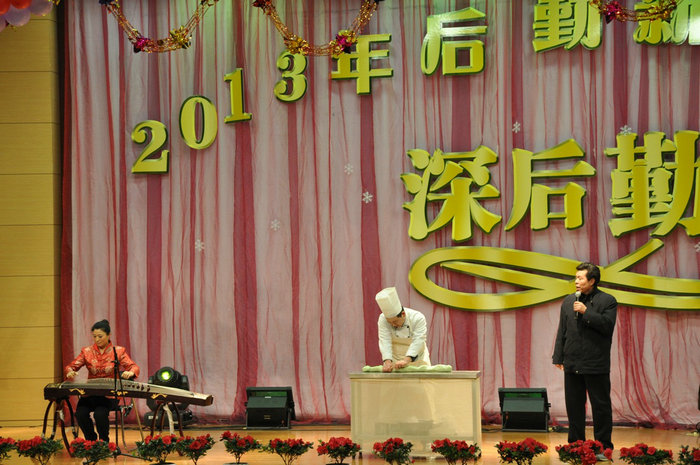 聯(lián)歡會(huì)開始前首先播放了視頻《石大后勤風(fēng)采錄》,視頻記錄了后勤人兢兢業(yè)業(yè)奮斗在各個(gè)崗位上的工作場(chǎng)景,回顧了2012年后勤的重要活動(dòng),同時(shí)各實(shí)體公司也在視頻內(nèi)送上了新春祝福。在聯(lián)歡會(huì)上,《好運(yùn)來》、《萬泉河水清又清》、《中華全家福》、《大地飛歌》等舞蹈表演歡快熱烈,表達(dá)了后勤人喜迎新春的愉悅之情;歌曲《真的好想你》、《獻(xiàn)給阿瑪?shù)母琛芳耙魳穭⌒∑贰都液腿f事興》情真意切,表達(dá)了思念親人、渴望團(tuán)圓的美好情感,展現(xiàn)了盡享天倫之樂的溫馨場(chǎng)景;滑稽表演、快板書幽默詼諧、精彩連連,令全場(chǎng)觀眾捧腹大笑;詩(shī)朗誦《奉獻(xiàn)的后勤人》則深情的表達(dá)了后勤員工對(duì)學(xué)校后勤事業(yè)的無限熱愛,而《古箏配樂拉面表演》這一極富后勤特色的表演更是讓員工們產(chǎn)生了共鳴。