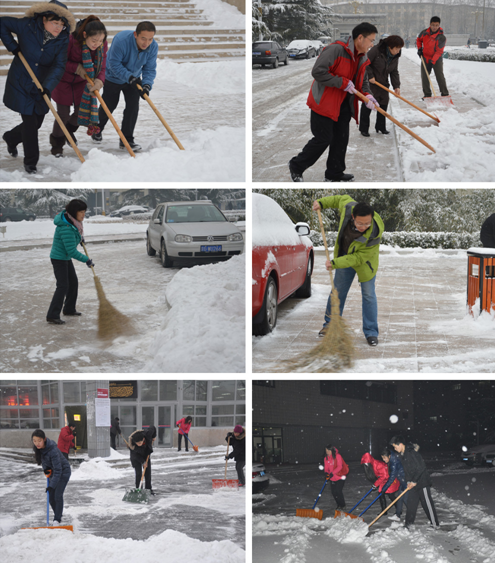 物業服務公司凌晨五點組織全體人員開始進行清掃工作,八點前將校園南北校區幾條主干道積雪清掃完畢,并備齊除雪作業所需的工具提供給志愿者使用。學生工作處組織各學院學生志愿者按各自劃分區域進行掃雪工作,共出動學生志愿者300余人次,圓滿地完成了清掃任務。校工會也組織了部分教職工加入到掃雪鏟冰志愿工作當中。后勤管理處組織人員對校園掃雪鏟冰工作進行了全面協調和檢查。