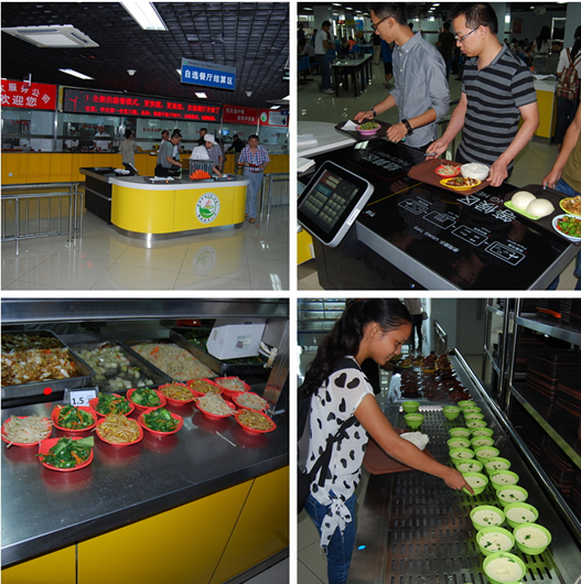 自選餐廳改變過去的窗口售飯方式,學生進入餐廳后進入食品自選區自選飯菜,就餐者可以根據餐盤顏色選擇不同價位的飯菜,在自助結算設備上利用餐盤底部的感應芯片進行自助刷卡結算,每人的結賬時間僅有1秒,且不會出現算錯帳、打錯卡的情況,整個消費過程方便快捷,不僅便捷衛生,而且避免了重復刷卡,大大縮短了排隊等候的時間。
