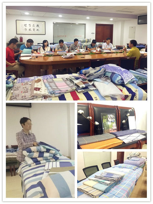 在會上投標企業分別做了產品展示和產品報價。各位標委現場仔細查看投標企業的床上用品布料質量、花色品種等,并根據投標企業的情況進行提問,最終經投票選定兩家企業作為學校新生入學床上用品官方指定銷售方。2017年迎新期間,新生可通過“后勤微信迎新系統”或到銷售現場自愿選擇購買。