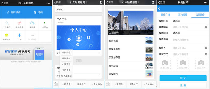 據(jù)了解,“石大后勤服務”微信公眾平臺作為學校首批上線的微信公眾號,自2013年9月運行以來,可以實現(xiàn)微信查詢服務電話、服務時間、意見反饋等后勤服務的各方面查詢功能,為進一步發(fā)揮微信在后勤服務中的作用,今年后勤聯(lián)合杭州格式科技公司對微信平臺功能進一步進行擴充,可以實現(xiàn)手機微信在線報修、訂餐、訂水等功能,目前各項功能正在開發(fā)中,近日將進行試運行。