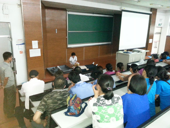 王永紅院長針對后勤工作特點對培訓內容進行了精心的準備,在培訓現場通過講授理論知識、現場示范、實際操作,為參訓的員工們講述了處理常見現場急癥的救護要領,進行現場急救的步驟、程序,撥打急救報警電話的注意事項,并借助模擬器材進行了心肺復蘇術等急救操作的演練。