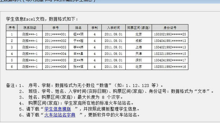 根據(jù)教育部高校學(xué)生司的文件通知,要求在學(xué)生火車票優(yōu)惠卡寫入學(xué)生姓名、身份證號(hào)碼、乘車區(qū)間、入學(xué)日期、優(yōu)惠次數(shù)等五項(xiàng)內(nèi)容,并將優(yōu)惠卡信息(含每張卡內(nèi)存的序列號(hào))注冊(cè)到學(xué)信網(wǎng),保證優(yōu)惠卡寫入信息和學(xué)生證填寫內(nèi)容、學(xué)生學(xué)籍電子注冊(cè)信息一致。對(duì)未寫入上述要求信息的火車票優(yōu)惠卡不予發(fā)售優(yōu)惠票。