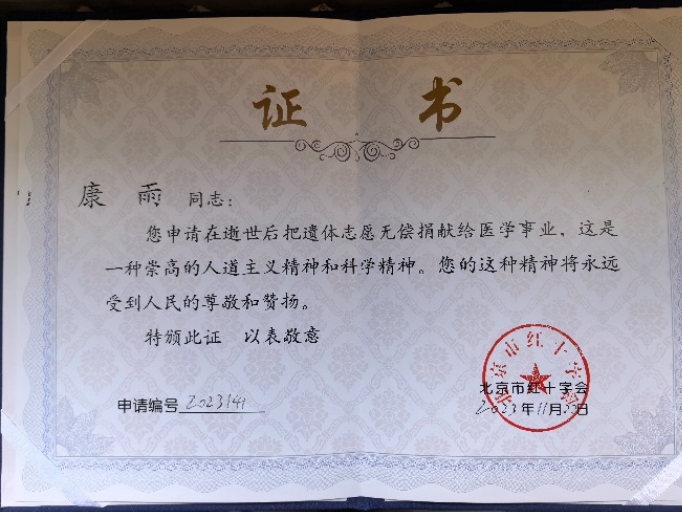 疫情期間,他從三方面人入手:常態化管理、制度配套、加強培訓,確保中心疫情防控指揮體系始終處于24小時應急響應狀態。2022年,面對轄區2處區域封控,他積極與海淀疾控中心、街道、社區配合協調,帶領員工,自采防疫物資,勇于挑起大院轄區的防疫重擔,為封控區獨居老師提供幫扶,為密接家庭提供上門維修,為住戶送物資,最終以零感染、零傳播為此次封控交上了一份滿意答卷,受到相關部門表揚。2023年11月康雨同志主動申請逝世后把遺體無償捐獻給醫學事業,為祖國的教育工作獻上自己的一份綿薄之力!
