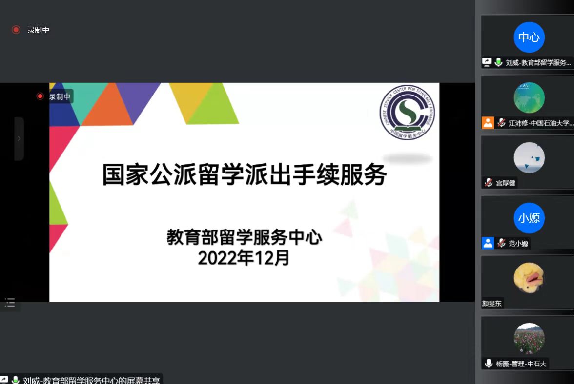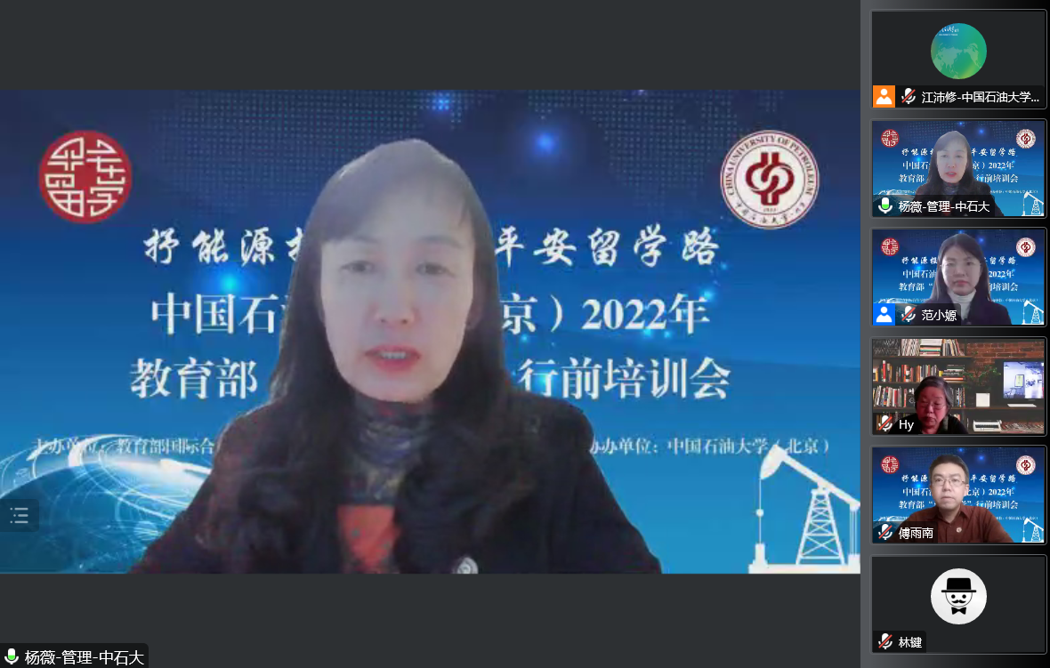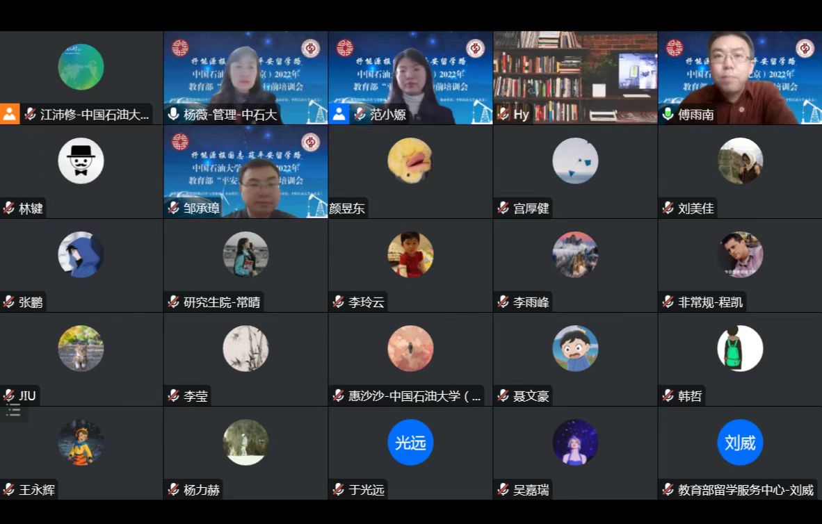 由教育部國際合作與交流司主辦、教育部留學(xué)服務(wù)中心承辦、中國石油大學(xué)(北京)協(xié)辦的2022年教育部“平安留學(xué)”行前培訓(xùn)會于12月8日14:00通過線上方式舉辦。本次培訓(xùn)會以“抒能源報國志 筑平安留學(xué)路”為主題,邀請教育部留學(xué)服務(wù)中心出國處副處長傅雨南和項目主管劉威、外交部領(lǐng)事保護中心一級調(diào)研員林鍵、中國政法大學(xué)副教授何啟豪、北京大學(xué)-清華大學(xué)出國留學(xué)人員心理健康支持項目組發(fā)起人何燕、我校馬克思主義學(xué)院教師鄒承璋以及黨委組織部、研究生院、國際合作與交流處、保衛(wèi)處相關(guān)部門業(yè)務(wù)負責(zé)人出席,為有出國留學(xué)計劃的同學(xué)做出國前安全知識講座和手續(xù)培訓(xùn)。培訓(xùn)會由國際合作與交流處處長楊薇主持,吸引了近百名學(xué)生參會。