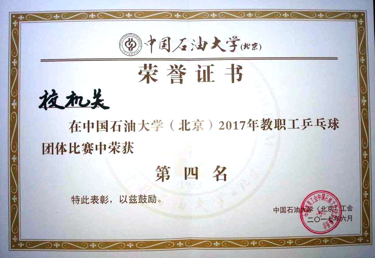 6月21日至22日,由校工會舉辦的“2017年度教職工乒乓球團體賽” 在昌平體育館如期舉行,校機關由剛文哲、龐雄奇、鐘立國、何闖、王都偉、李吉川、劉海燕、徐雪梅、楊曉潔、宋愛平和方莉共11位運動員組成代表隊,參加了全部比賽并最終取得了第四名的好成績。