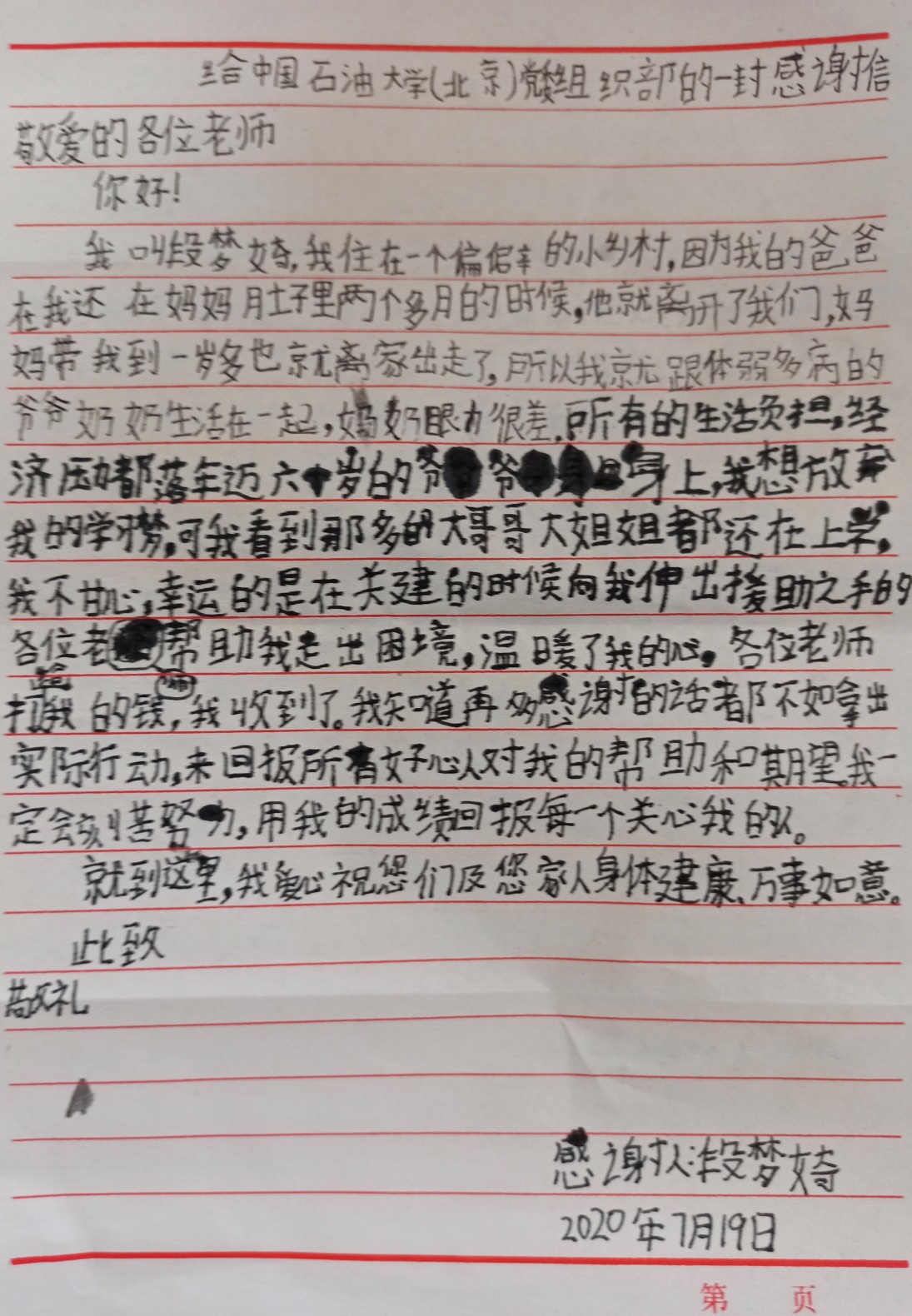 7月19日下午,組織部統戰部聯合黨支部收到了來自云南省南華縣龍川鎮河硐村段夢婍同學的感謝信。信中,段夢琪同學用真摯的文字表達了結對幫扶以來支部在物質上幫助、在精神上關愛的感謝。