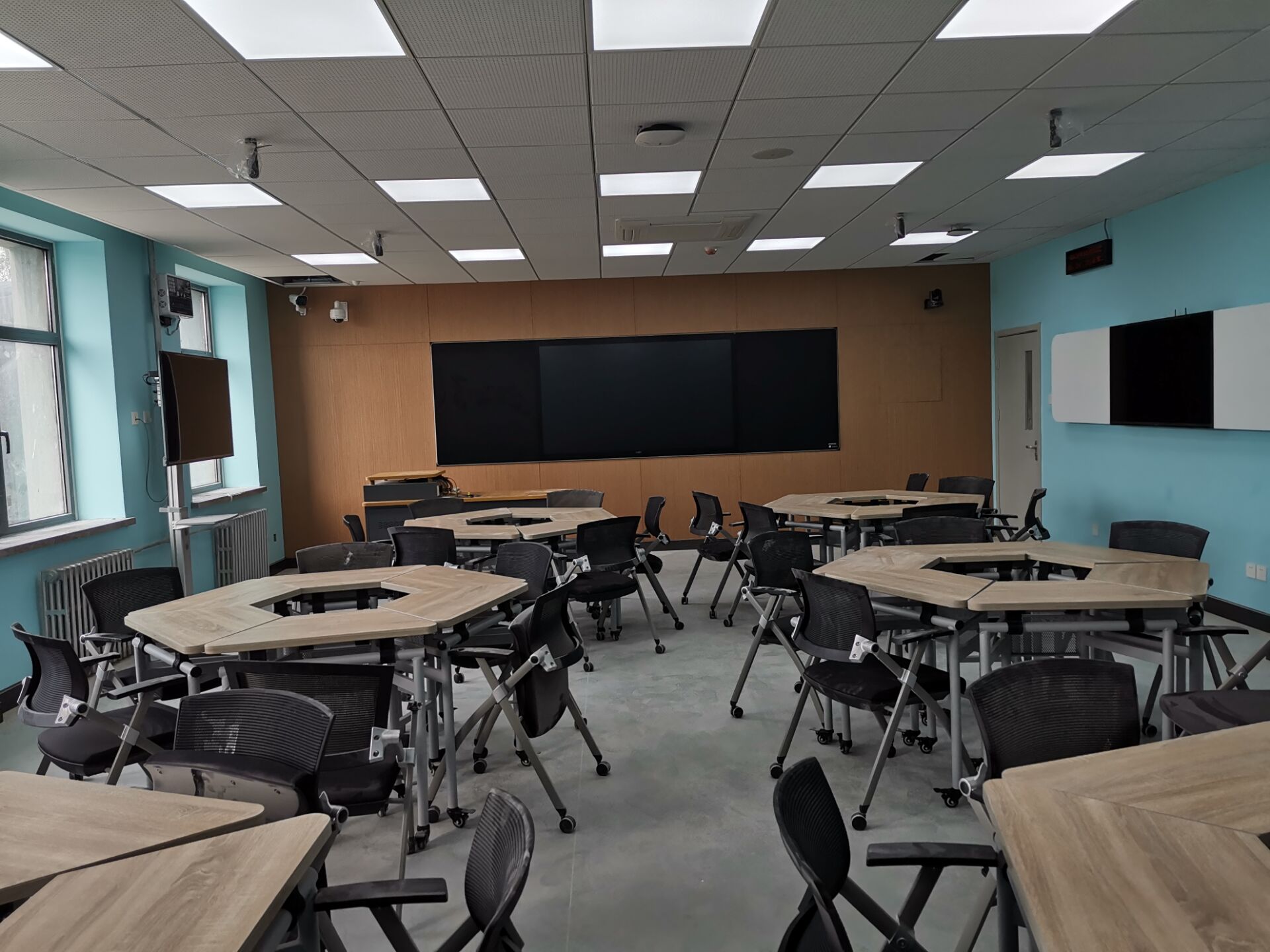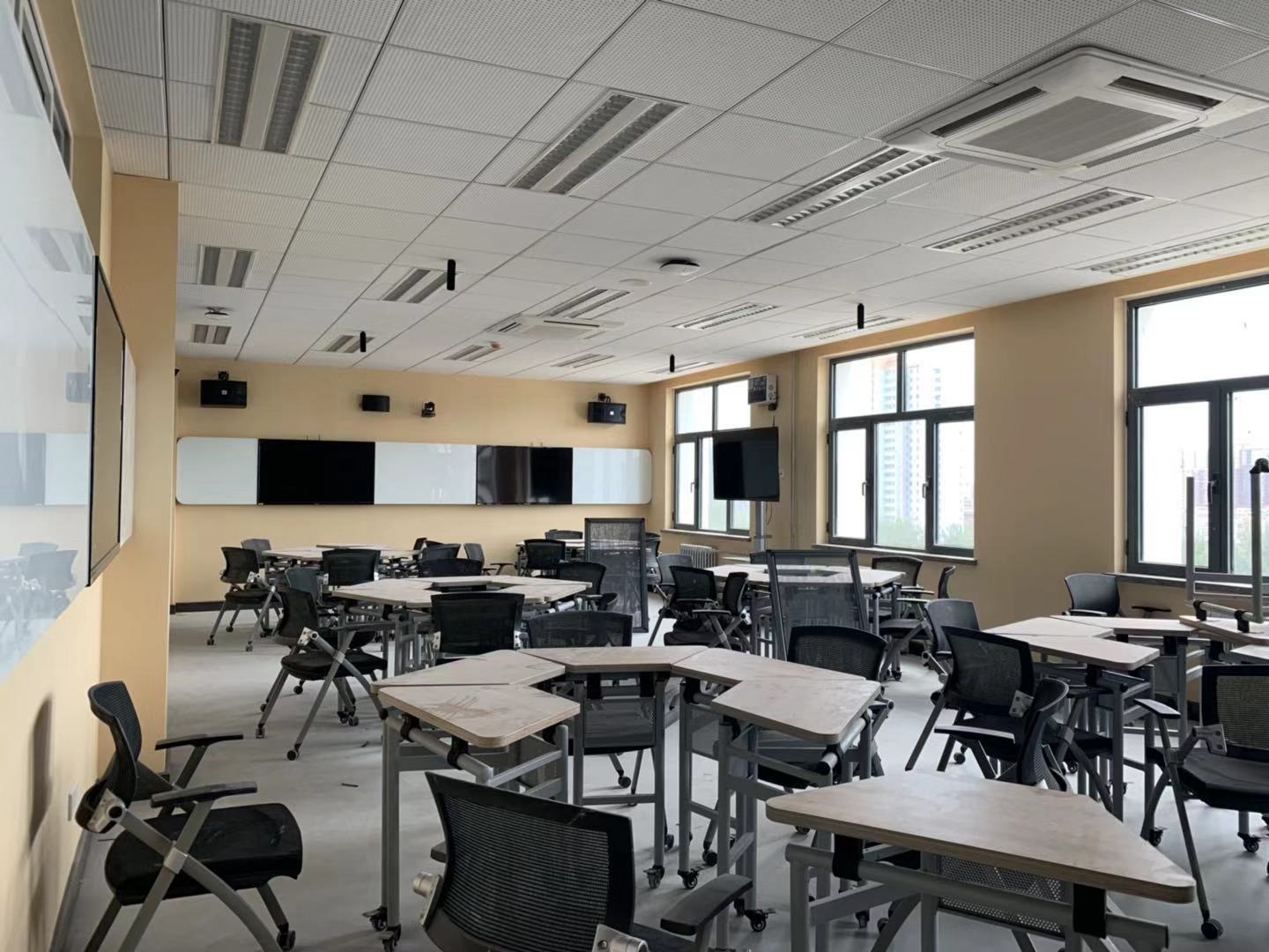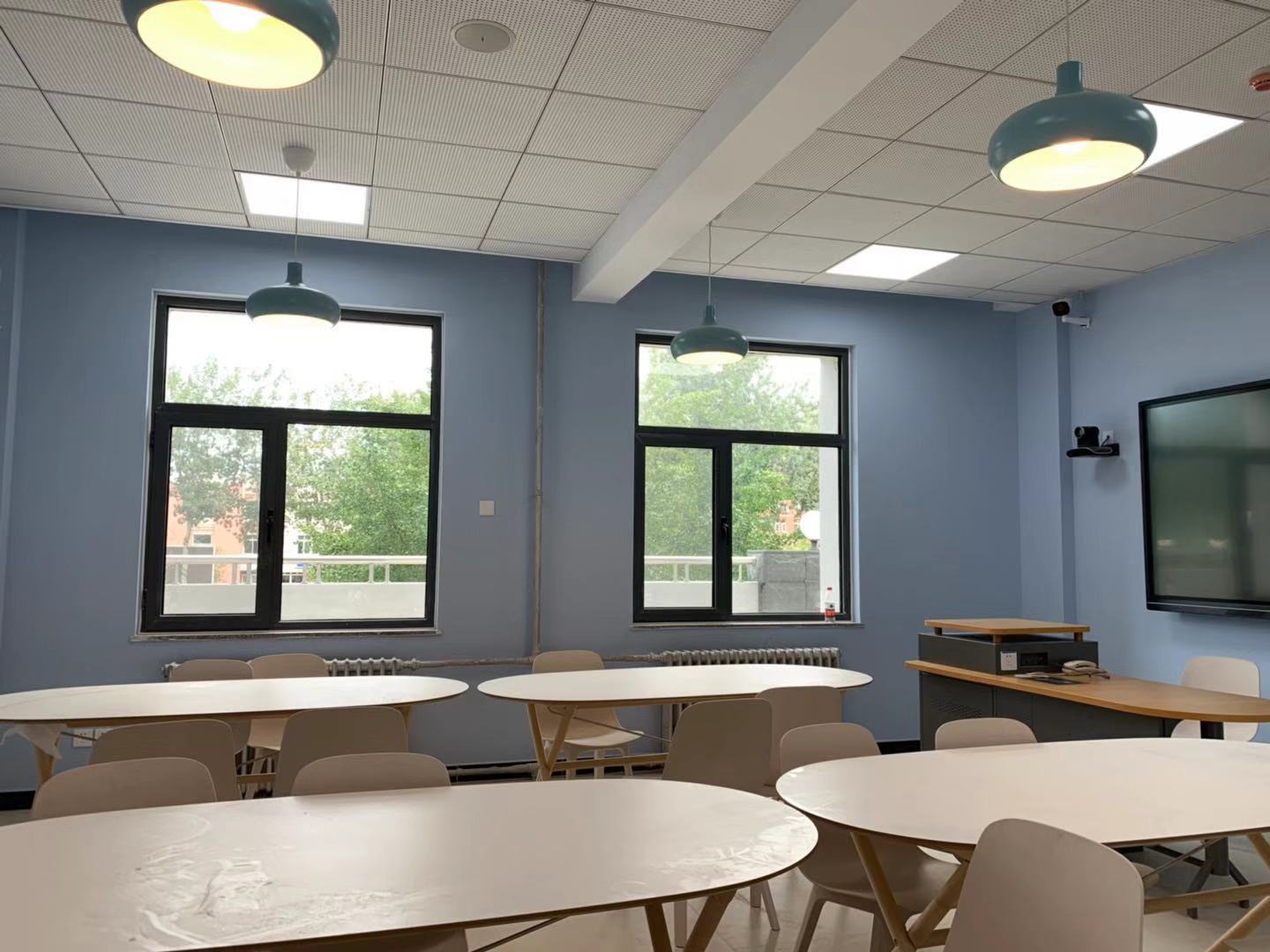 此次教室內部改造針對教學改革需求,以新型教學模式為導向,以提升研究生培養質量為目標,滿足研究生教學不斷發展的需求。我校經外校調研、嚴密論證精心打造了“智慧教室”和“特色教室”。“智慧教室”是遠程互動教室、多屏互動教室、錄播教室等的集合體,智慧教室建設不僅能豐富教室功能,也可以適應小班化教學、混合式教學、翻轉課堂、研討式教學等新形態的教學需要,科技感十足?!疤厣淌摇蓖ㄟ^改變傳統教室清一色白墻及傳統家具、燈具等,營造出溫馨、輕松、舒適的氛圍,打造了全新的教學環境,讓學習環境變成美麗的風景。