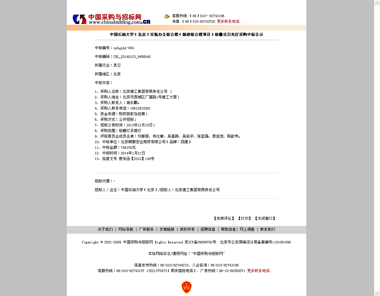 附圖: 中國采購與招標網中國石油大學(北京)實驗辦公綜合樓(新建綜合樓項目)燈具采購招標結果公示