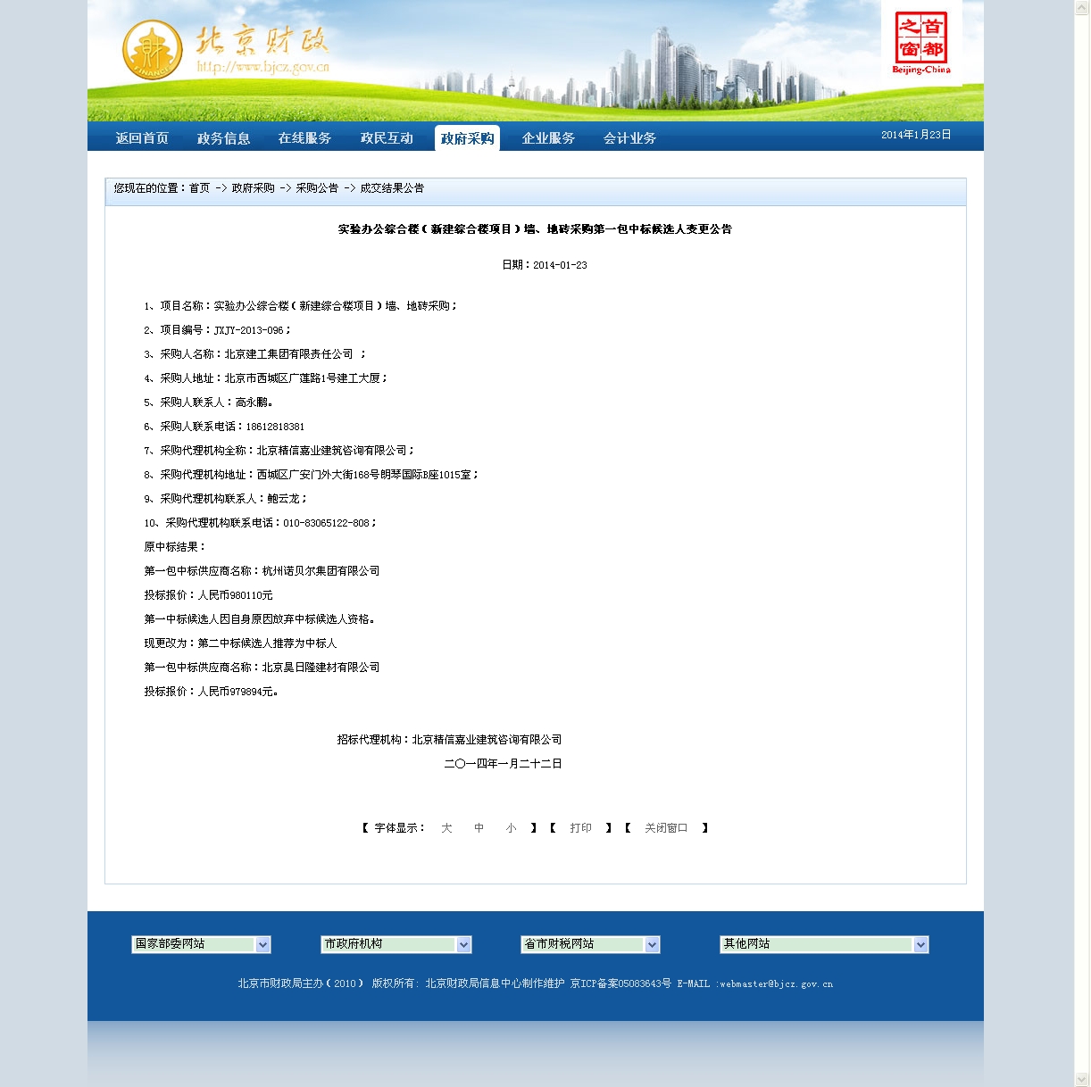 北京市財政局中國石油大學(北京)實驗辦公綜合樓(新建綜合樓項目)墻地磚采購中標候選人變更公告
